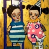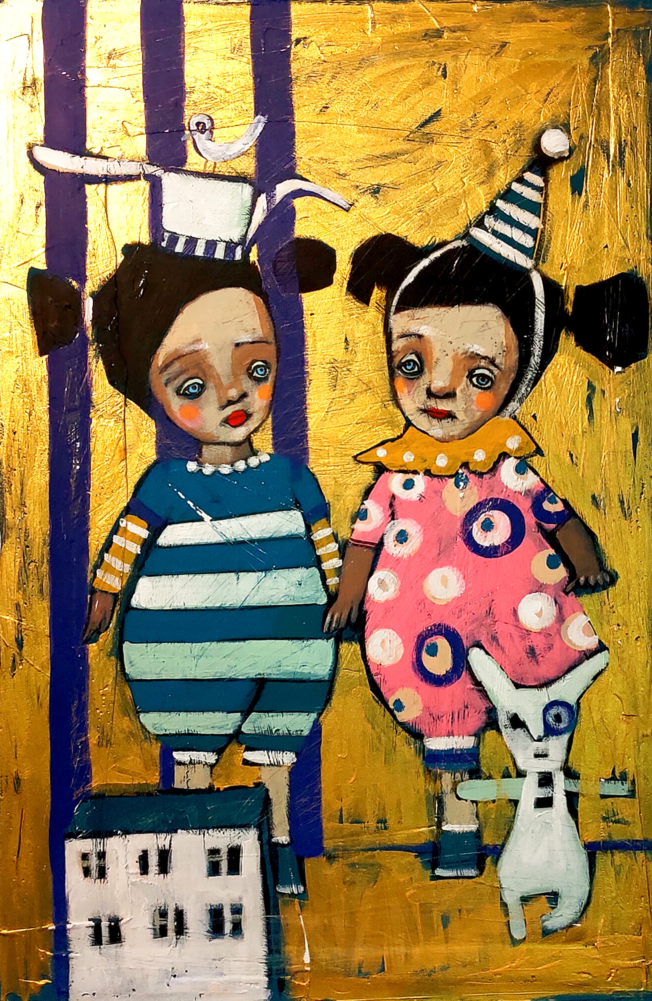 This canvas depicts two little girls reminiscent of dolls or circus characters. They are dressed in bright colorful costumes - one in blue stripes, the other in pink polka dots. They have funny hats on their heads: one has a party hat, the other has a teapot with a white bird sitting on it. The girls are holding hands against a background of golden stripes, which evokes associations with a theater stage or a fairy-tale kingdom. There is a white toy cat nearby, and a small house at their feet. The girls' faces are sad and slightly confused, which, given the bright colors of their outfits, creates a spectacular contrast. The atmosphere of the painting is incredibly warm, but with a hint of anxiety, as if this is a memory of a carefree childhood, hidden behind the curtain of a strange dream.