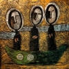 This painting is filled with mysticism and symbolism. In the foreground is a green boat, on which stand three mysterious figures in long black robes. Their hands are clenched and lowered, all three are facing the viewer, but their faces look more like masks with abstract features than real human ones. Light halos are painted around their heads, giving them an alien or even sacred look. The background of the painting is rich in golden, textured brushstrokes, creating the feeling of an ancient wall or lace. Behind the boat, a strip of water is visible, dividing the painting into two parts: real (earthly) and fantastic (golden). Everything fills the scene with mystery and a slight melancholy - as if the characters are making a spiritual or metaphorical journey along the river of time.