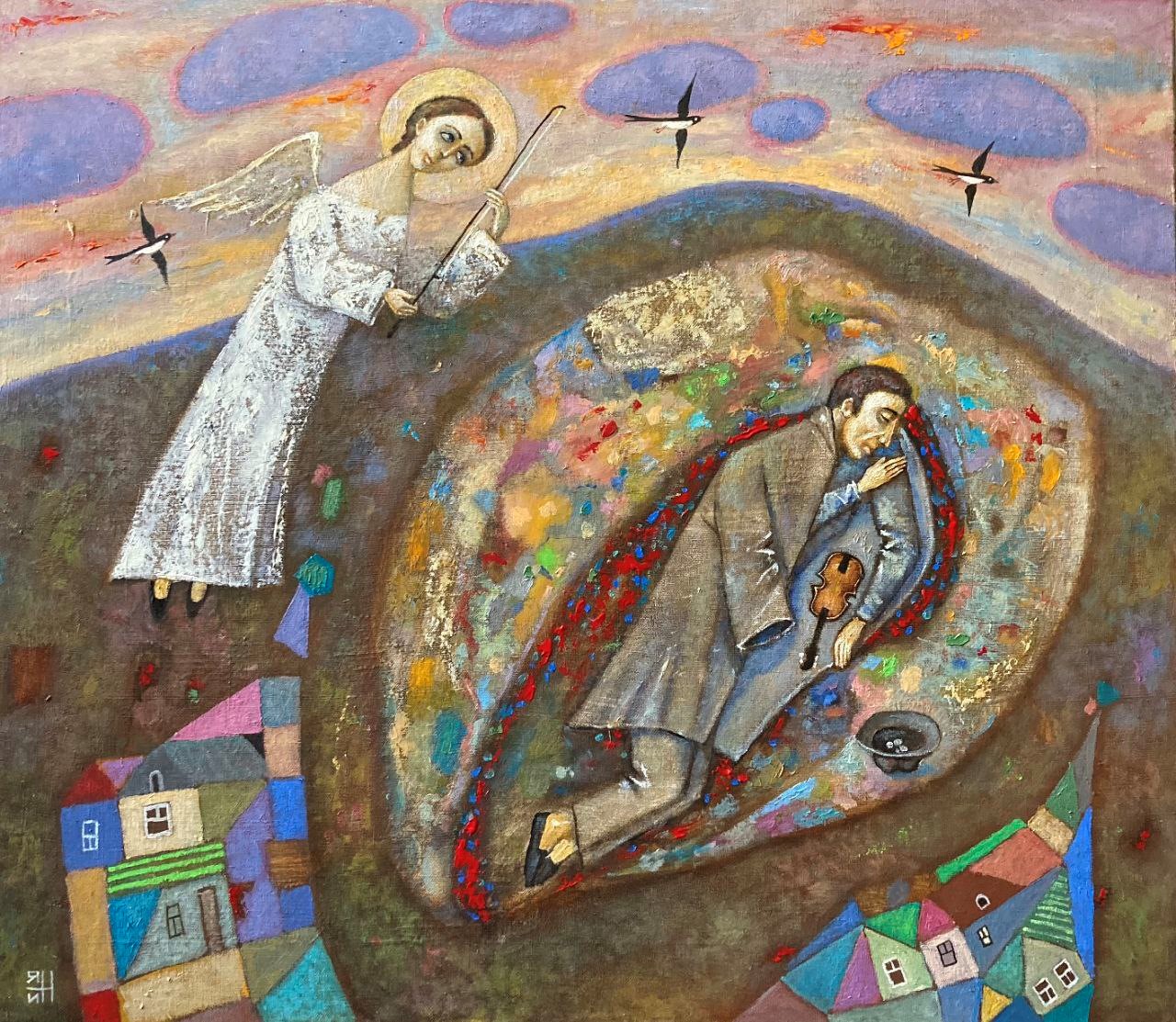 An angel in white robes hovers above the man, holding a conductor's baton. His gaze is filled with compassion, as if he is conducting fate or escorting a soul to another world. In the sky, there are three flying birds - they can symbolize freedom, the soul that leaves the body.