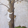 The painting depicts three angels hiding behind the trunk of a tall tree. Their white robes and wings create a feeling of lightness and airiness, and their expressive faces convey curiosity and mystery. One of the angels reaches out to a single golden fruit hanging on a branch, adding a touch of alluring mystery to the plot.