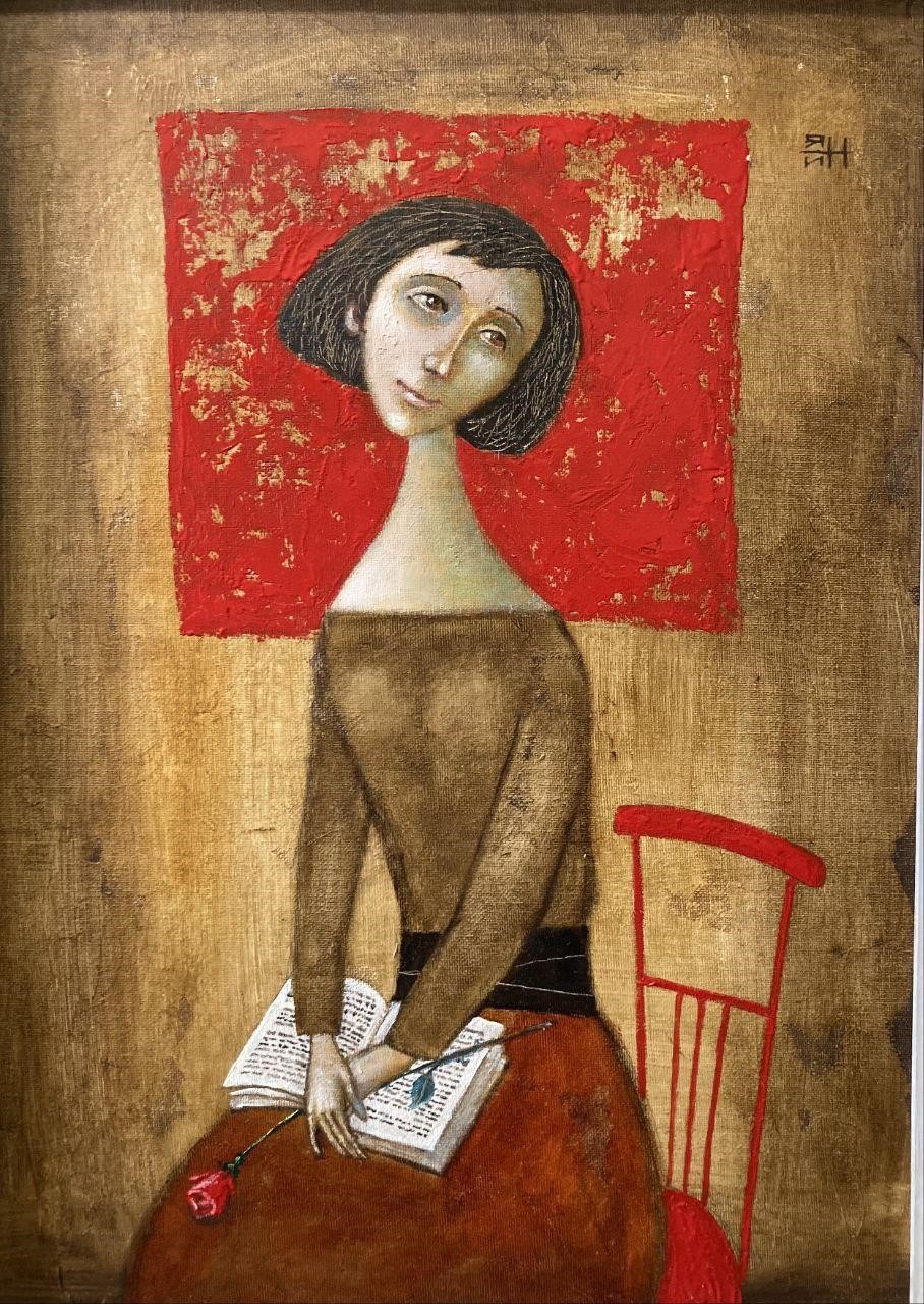 The image shows a mysterious young woman with an elongated neck and a thoughtful expression on her face. She is sitting at a table, her hand resting on an open book with a pen in it, and a red rose is lying next to her. The background of the painting is decorated with warm brown tones, and a fragment of red stands out behind the woman's head, creating a halo effect.