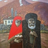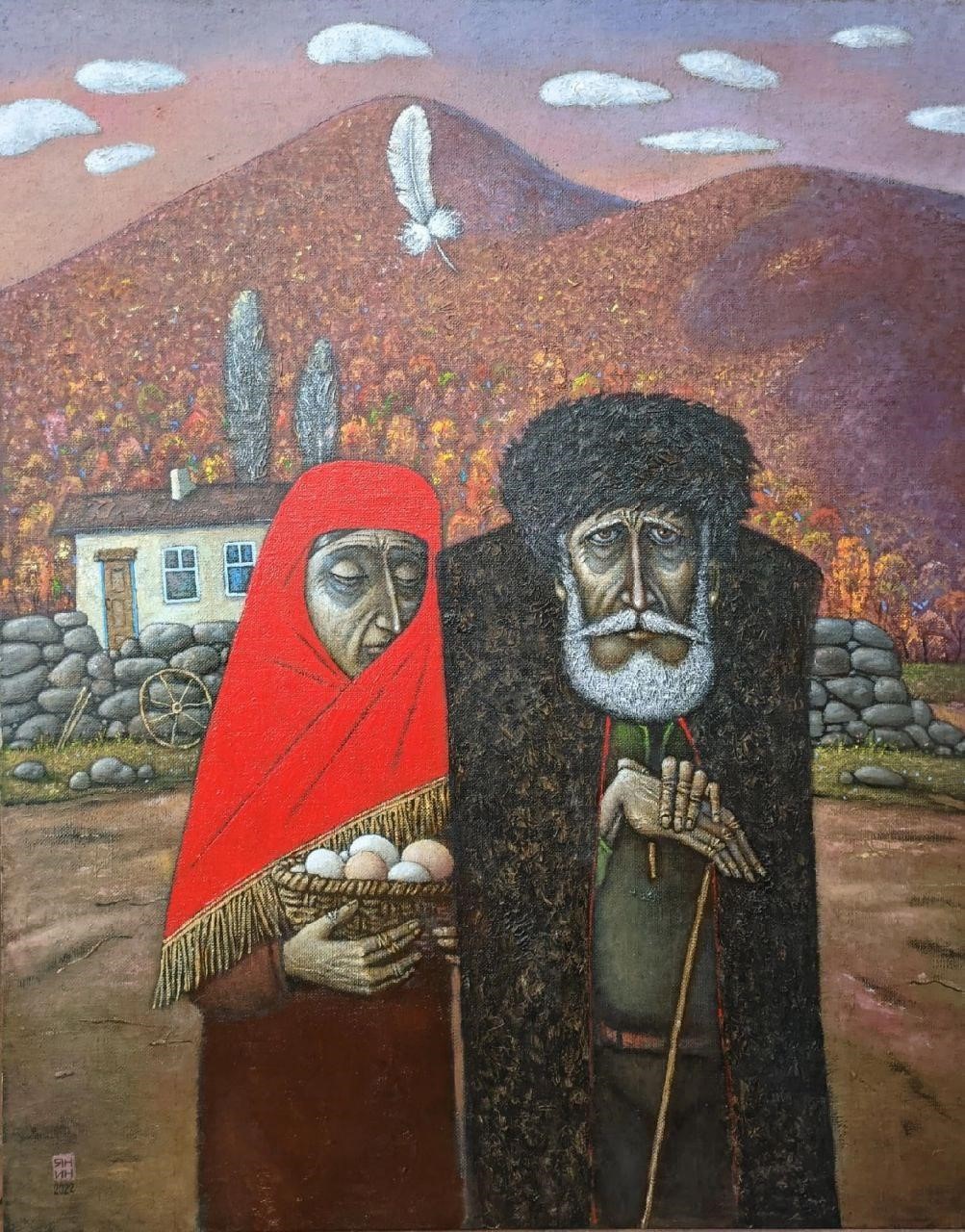 The painting depicts an elderly man and woman against the backdrop of an autumn landscape with a house and mountains. Their faces express sadness, fatigue and worldly wisdom. The man leans on a staff, is dressed in a warm fur caftan and papakha, his thick beard and attentive gaze emphasize the life experience he has lived through. The woman, wrapped in a bright red scarf, holds a basket of eggs, symbolizing care, work and procreation.