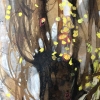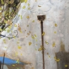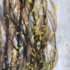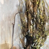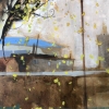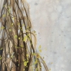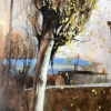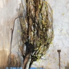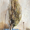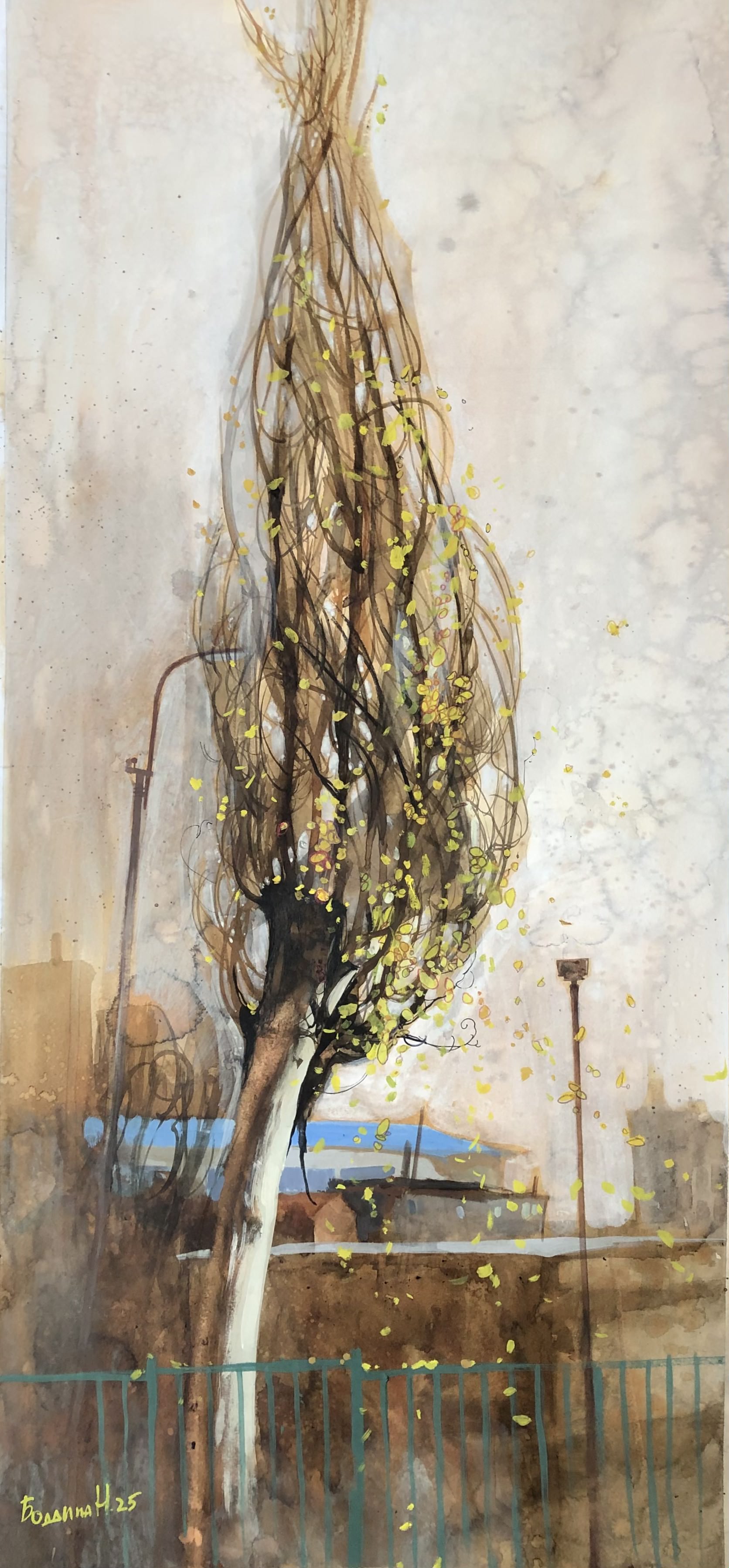 The vertical format of the work emphasizes the slenderness and airiness of the main character - a young tree with a thin whitish trunk and long, flexible branches. Yellow spring leaves can be seen through the dense web of branches, which seem to flutter in the wind. Behind the tree are barely distinguishable city buildings, a blue horizon line and old street lamps. The color scheme is maintained in natural tones: brown-gray and ochre spots turn into a blue sky in the distance. The whole scene is filled with a feeling of early spring, a slight sadness of the tree's loneliness and, at the same time, its resilience and hope for renewal.