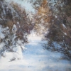 A winter path opens up before the viewer, stretching into the distance among bushes and trees covered with a thick layer of snow. The painting is filled with light - along the path, glares of the blue sky are visible, breaking through the dense foliage. Cold blue and white shades predominate, enlivened by golden and ochre splashes symbolizing the remains of autumn foliage or the setting sun. The composition creates a feeling of peace, silence and solitude of a winter forest, as if the artist invites you to walk along a snowy path.