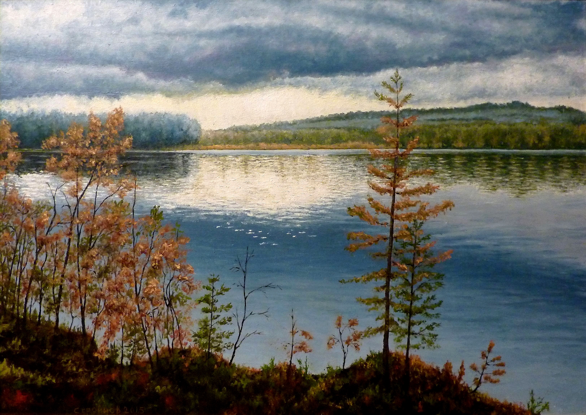 In the foreground are the shores of a calm lake, overgrown with thin young trees and bushes with autumn foliage in brown-gold shades. The water mirrors the heavy, cloudy sky. Light breaks through the clouds, forming a pale spot of light on the horizon and reflecting in the water. In the distance, wooded hills shrouded in haze are visible. The picture is filled with an atmosphere of anticipation: it seems that rain is about to pour down. The color scheme is based on the contrast of cold blue shades of water and warm ochre tones of trees.