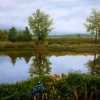 The foreground is highlighted by bright flowers and lush grass near the water. The surface of the pond is absolutely calm and reflects the surrounding trees like a mirror. In the distance is a forest strip, various shades of green and gold. A light haze over the distant horizon gives a morning or evening mood, fills the air with soft light and humidity. Above, the sky is covered with light clouds, creating a feeling of peace, freshness, novelty of a new day or midday nap.