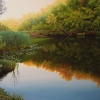 The landscape depicts a calm riverbed or a large stream in the pre-evening hour. The banks are densely overgrown with shrubs, sedge, and reeds. The water reflects the green wall of the forest and the golden glow of the setting sun: the slopes of the trees and foliage are illuminated by a warm light, turning into ocher and orange shades. Lilies are visible on the surface of the water. The first twilight fills the space with a light haze, the picture immerses you in an atmosphere of coziness, relaxation and natural harmony.
