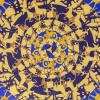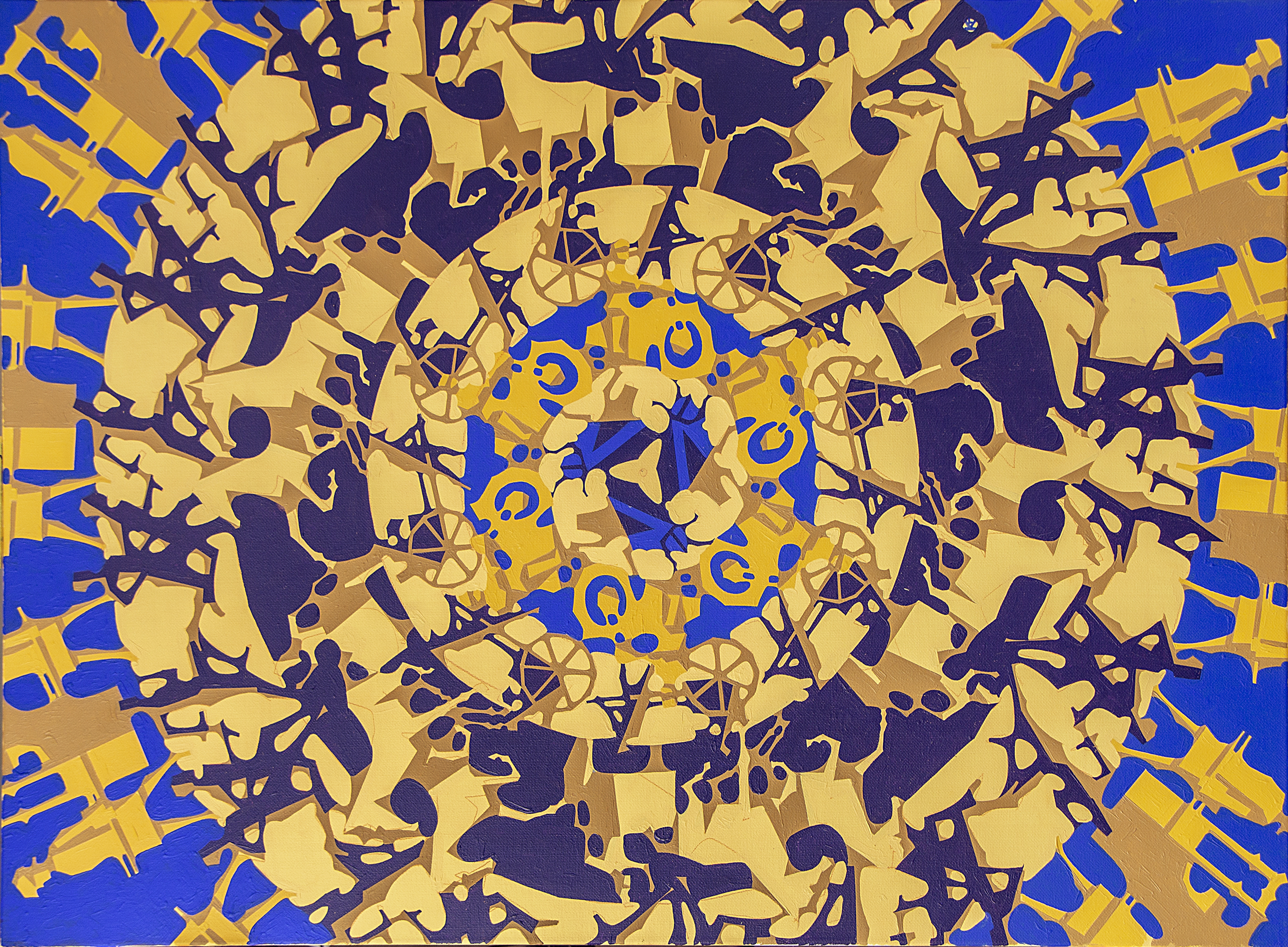 This canvas shows figures of people and horses, intertwined in a characteristic ornamental pattern. Only a few colors are used: bright yellow and deep blue, thanks to which the picture looks very bright and even festive. The inner circle is built from repeating wheel motifs, which creates a sense of rotation and dynamics. The work seems to illustrate an active life: movement, interaction of people with technology and with each other.