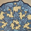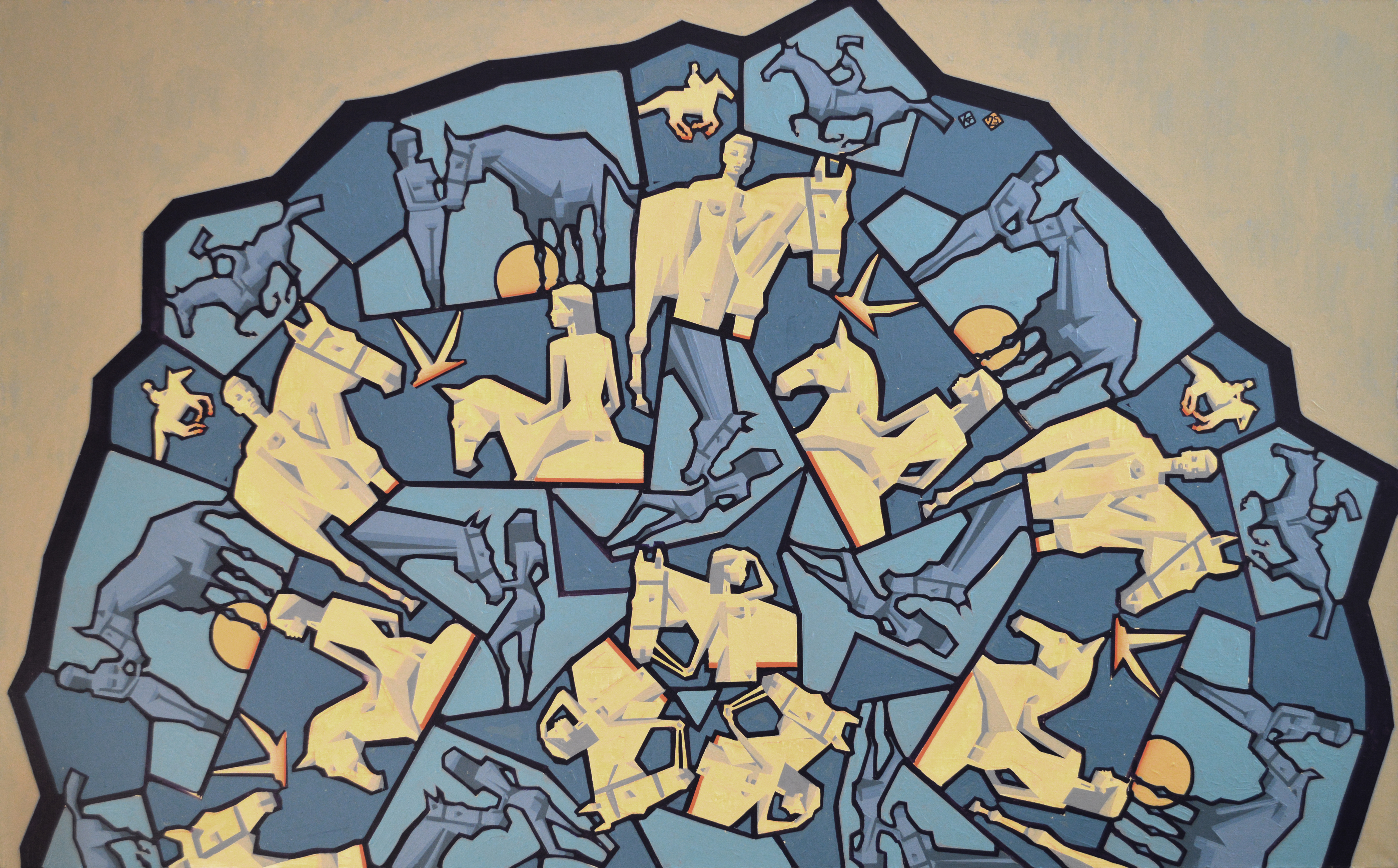 In the center of the composition are several riders and their horses, stylized as mosaic fragments, slowly merging into each other. The main color palette is maintained in cool blue and blue tones, which echo the warm yellow light. The figures of people and horses form an intricate dance inside the polygon, which adds semantic and visual complexity to the work. The painting is associated with the theme of the unity of man and animal, the conquest of the elements and internal movement.