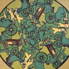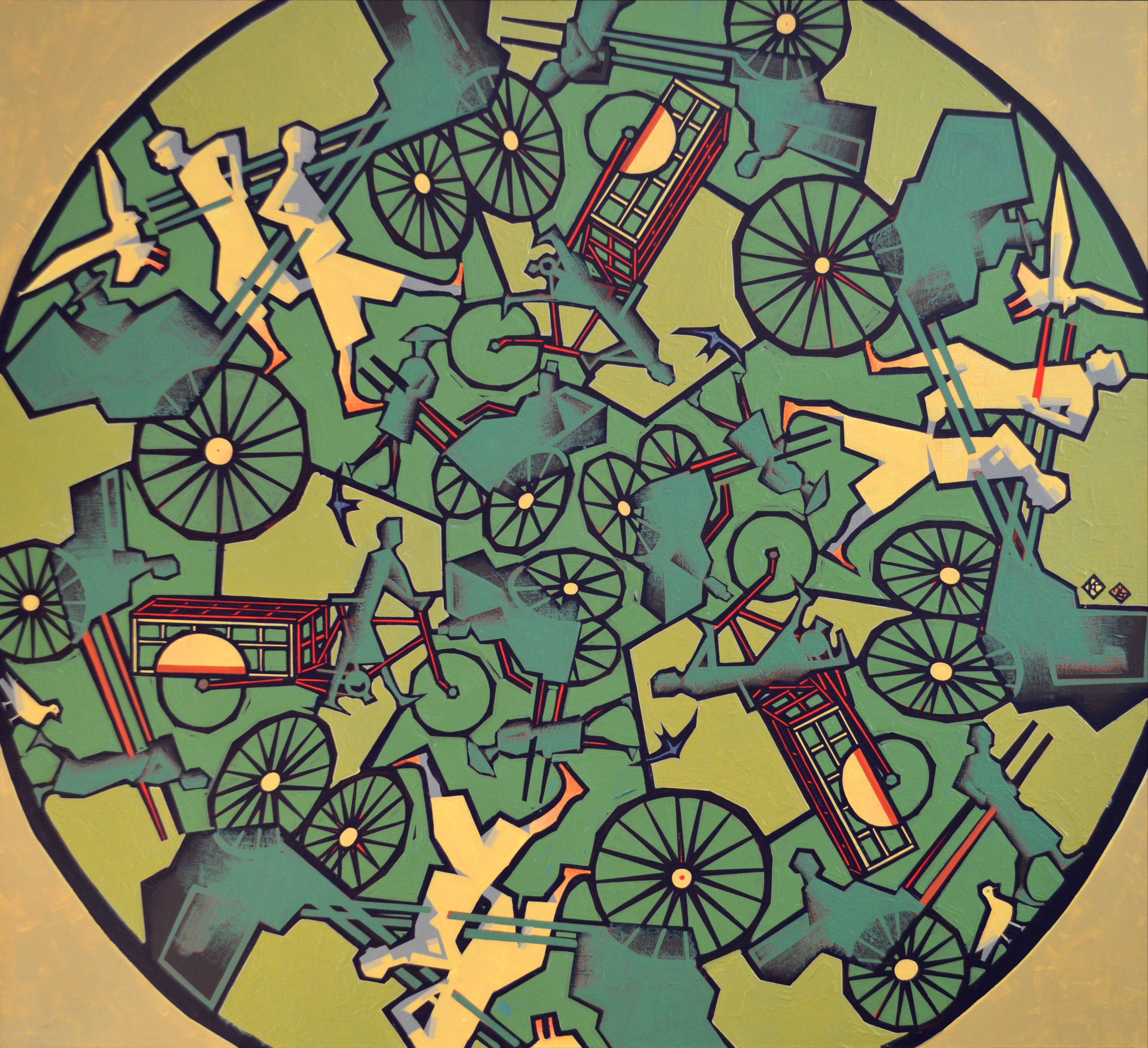 A thematic motif of old carriages and carts lies in the center of the composition. The silhouettes of people and wheels, executed in green, yellow and red shades, repeat around the entire circle. This creates the illusion of an endless journey, in which everyone is the driver of their own destiny. The entire work is maintained in a single color scheme with thin graphic lines that unite individual elements into a complex but harmonious composition, referring to the history of transport development.