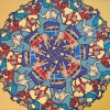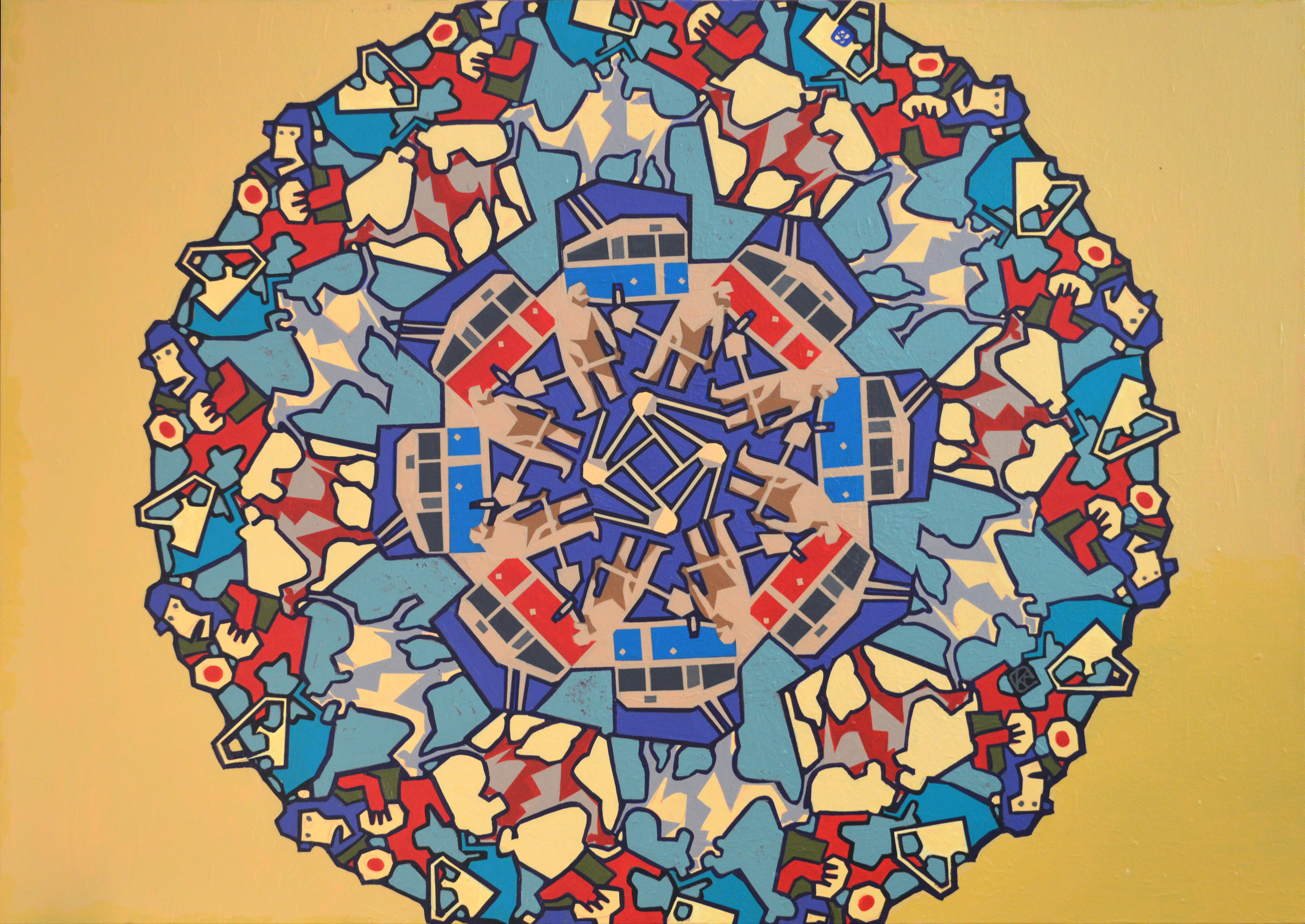 This is a complex mandala built on repeating motifs of transport and people. The central part of the composition is occupied by buses and human figures, stylized as passengers or drivers. They are arranged in such a way that they create a kaleidoscope effect, where each element smoothly flows into another. Along the edges, stylized images of people in blue, red and turquoise clothes are visible, complemented by elements of suitcases and bags, which refers to the theme of movement, travel and city bustle. A cheerful palette dominates - beige, light blue, red and blue. The picture evokes a sense of organizational order within the chaos of city life.