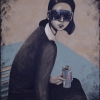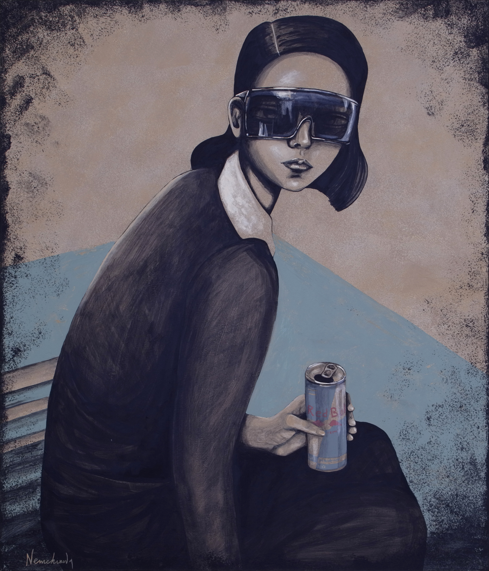 Before us is a girl in a dark dress with a white collar, sitting on a bench. She is depicted in profile, but slightly turned towards the viewer. Her hair is combed smoothly, and her eyes are hidden behind massive modern glasses that dominate her face, making the image almost futuristic. In her hand, she holds a can of drink - probably an energy drink, as indicated by the partially readable logo on the aluminum surface of the can. The range of the work is maintained in restrained tones, giving emphasis to the accessories. The background is minimalist: the blue triangle can be a carpet or just part of an abstract space, and the edges of the canvas are processed with a rough black frame. The girl's gaze is serious, as if she is busy with her thoughts or immersed in contemplation.