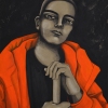 A young man with very large, dark eyes and measured facial features is located against a rich black background. He is wearing a black T-shirt and a scarlet cloak, which stands out strikingly against the background of the overall gloomy range. The young man holds a stick or the handle of some object in his hands, which gives the pose significance and depth. The large hand, like the face, reaches out to the viewer, and the look is both stubborn and thoughtful. The ears stick out slightly, the eyebrows are thick, the lips are compressed. The picture is filled with inner energy: a child from a big city, a person with a difficult life and character, combining softness and strength.