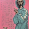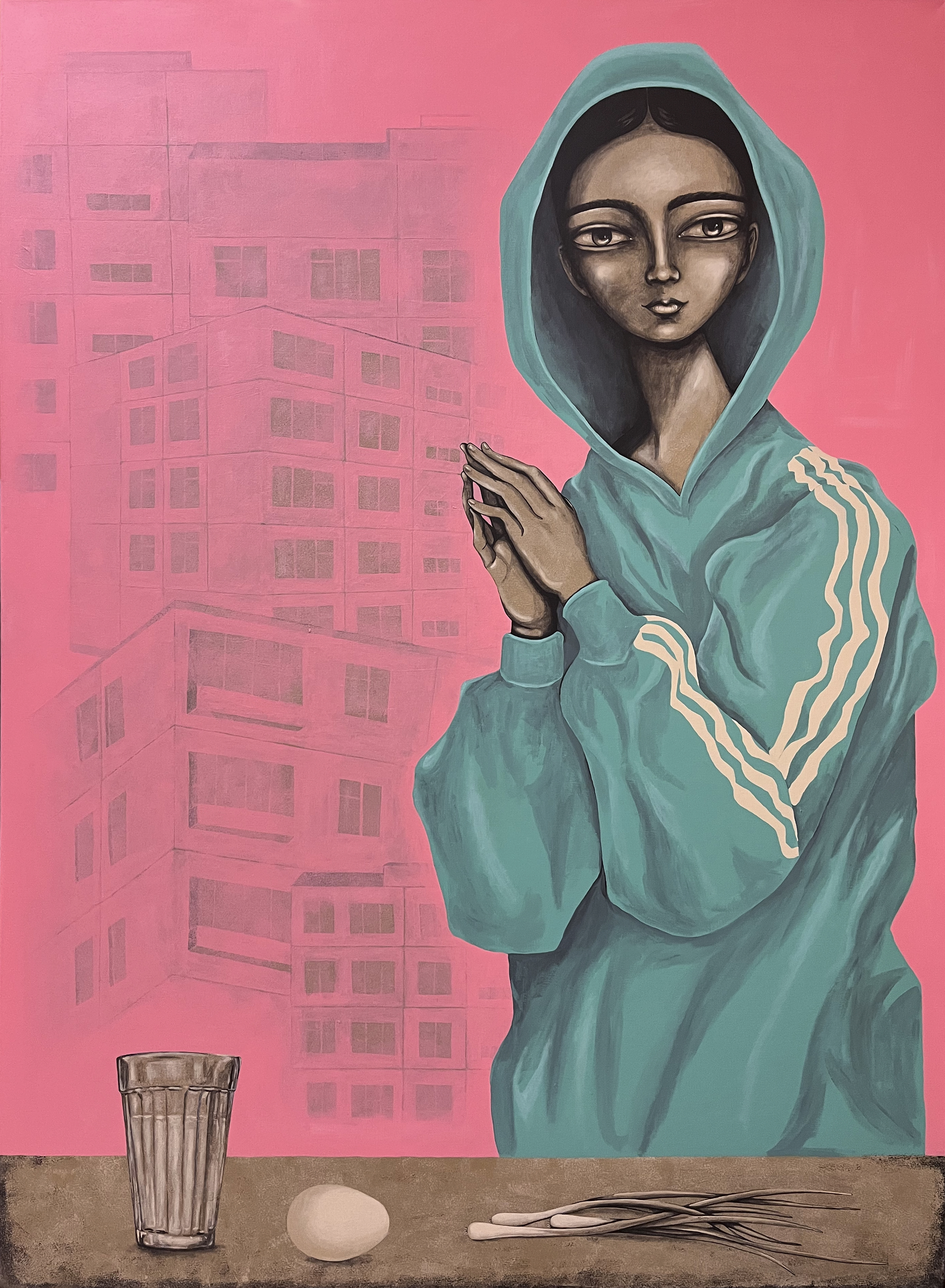A young girl in a bright turquoise hoodie with white stripes is depicted against the background of a bright pink plane, on which the contours of multi-story buildings are barely distinguishable. Her facial features are stylized and wide open, there is a slight sadness in her gaze. She holds her hands folded, as if she is about to do something or pray, and in front of her on the table is a glass of water, an egg and a bunch of green onions. The whole scene resembles an allegorical still life, where the surrounding objects are filled with hidden meaning. The girl against the backdrop of urban architecture looks vulnerable, as if she is protected only by her hoodie, and her eyes speak of inner tension. The play of bright and pastel colors is combined with soft sadness or loneliness of modern city life.