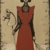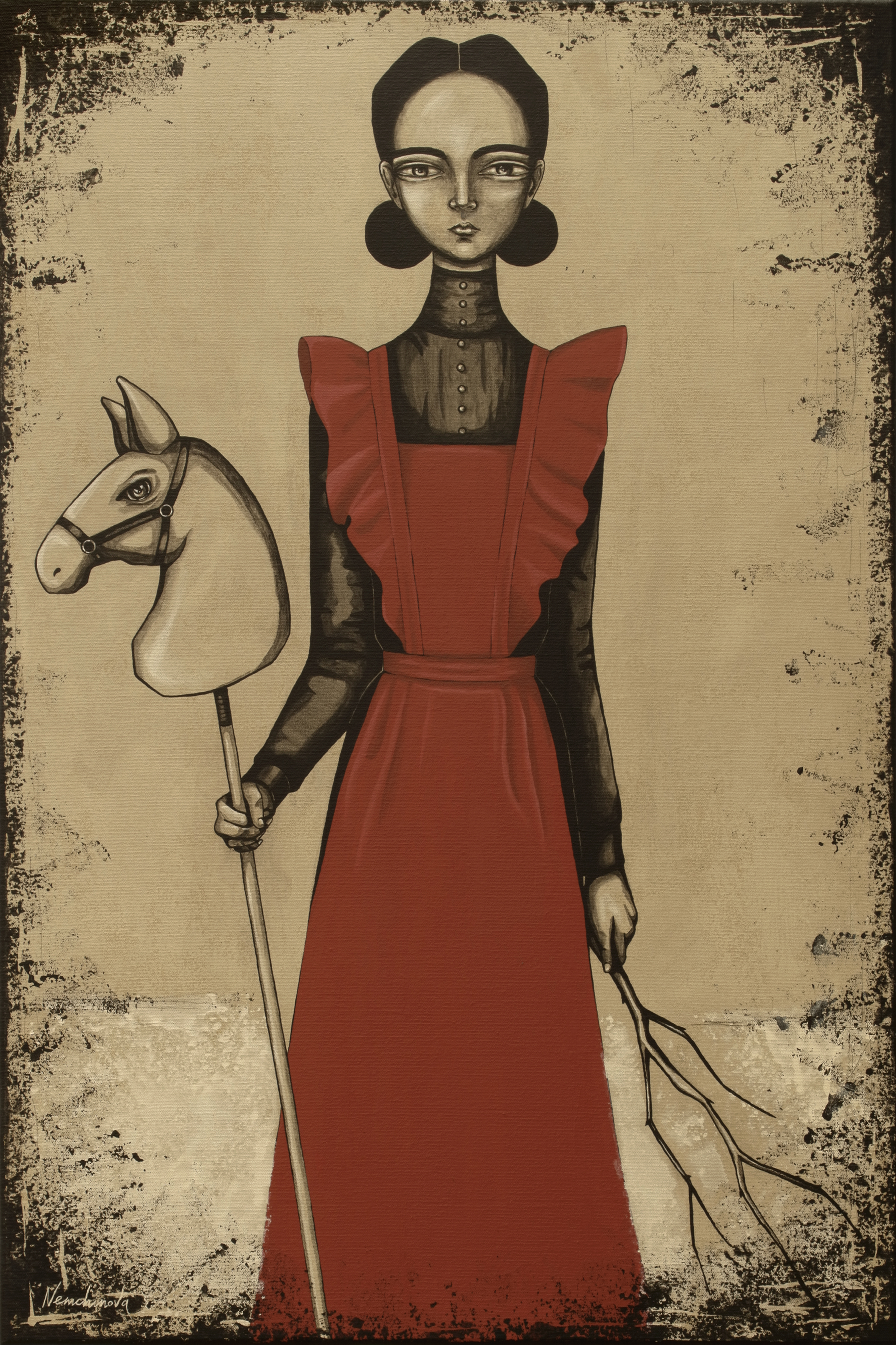 In the central part - a tall girl in a strict dark outfit, over which she puts on a bright red apron with frills. In her left hand she holds a horse-shaped stick from children's games, in her right - a bunch of dry, barren branches. Her face is calm, her eyes are large and expressive, her hairdo with two large bows completes the image. The background is beige with a dark, worn frame along the edges, which resembles an old theater poster or a vintage photo. The whole scene looks semi-fantastic and emphasizes the longing for childhood, fairy tales, and strict internal discipline mixed with vulnerability.
