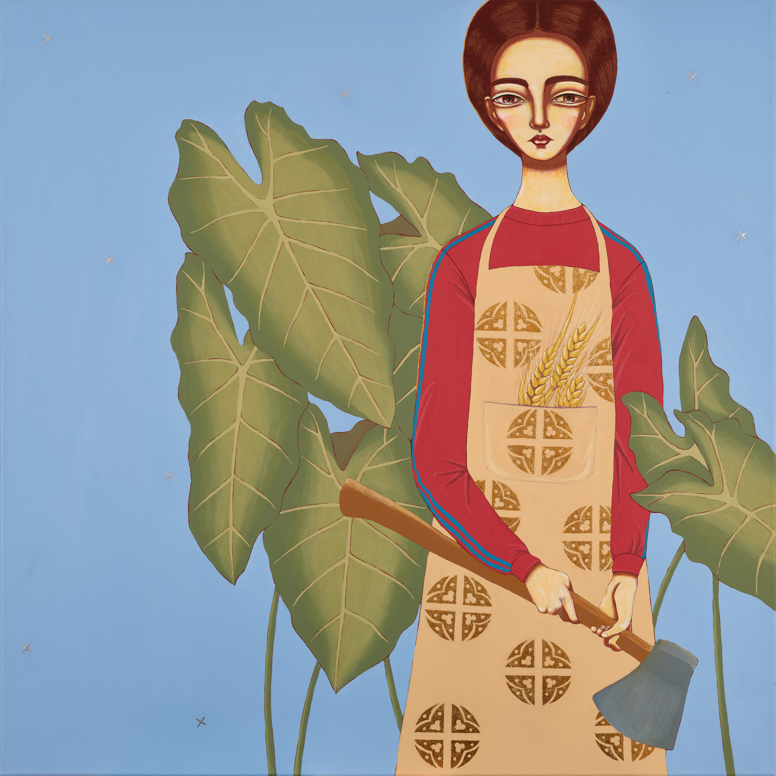 A young woman stands against a soft blue background, dressed in a bright red blouse with blue stripes on the sleeves, over which there is a light apron with a pattern: circles resembling a symbol of grain or baking, and in the pocket there is an ear of wheat. In her hands she holds a large axe. Behind her are huge green leaves, similar to alocasia or monstera, which creates the impression that the person has become part of nature or is protecting her green oasis. The eyes are lyrical, the hairstyle is symmetrical. This combination of calm, home comfort (apron, ear of wheat), natural strength (axe, leaves) and slight anxiety (determination in the look) creates a complex, multi-layered image.