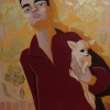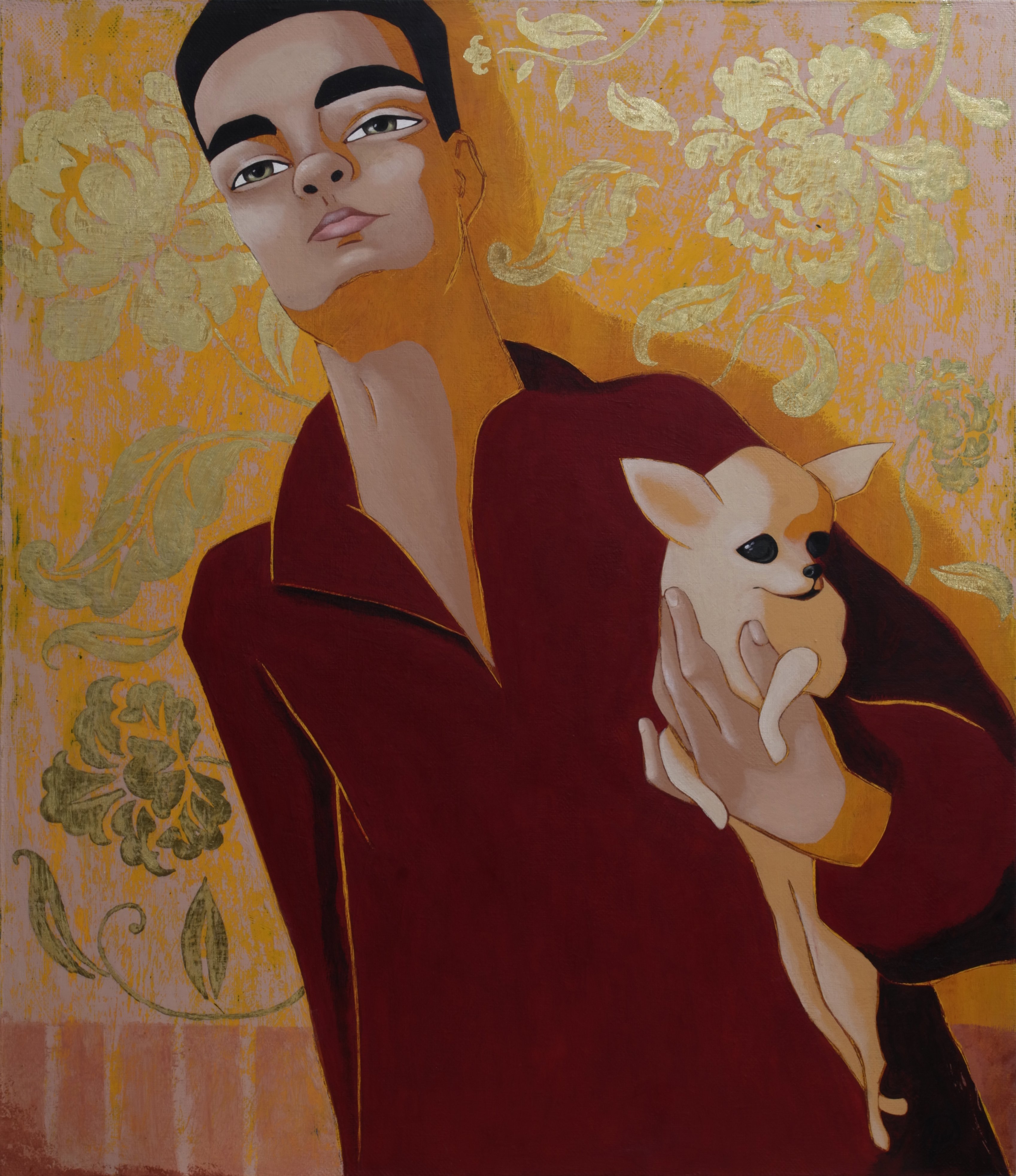 A young man with a short haircut is depicted against a bright orange background with a golden, ornate pattern of ex-wallpaper. He slightly raises his chin, and his gaze is direct, confident. His lips are slightly raised in a half-smile, and the whole pose speaks of calm, and perhaps even of some inner pride. The guy is wearing a burgundy shirt. He holds a tiny Chihuahua in his arms, which looks out with kind black eyes. The presence of the dog gives the whole work a bit of humor and tenderness, and the golden background, shimmering with nobility, frames the scenes like an old portrait or an iconostasis.