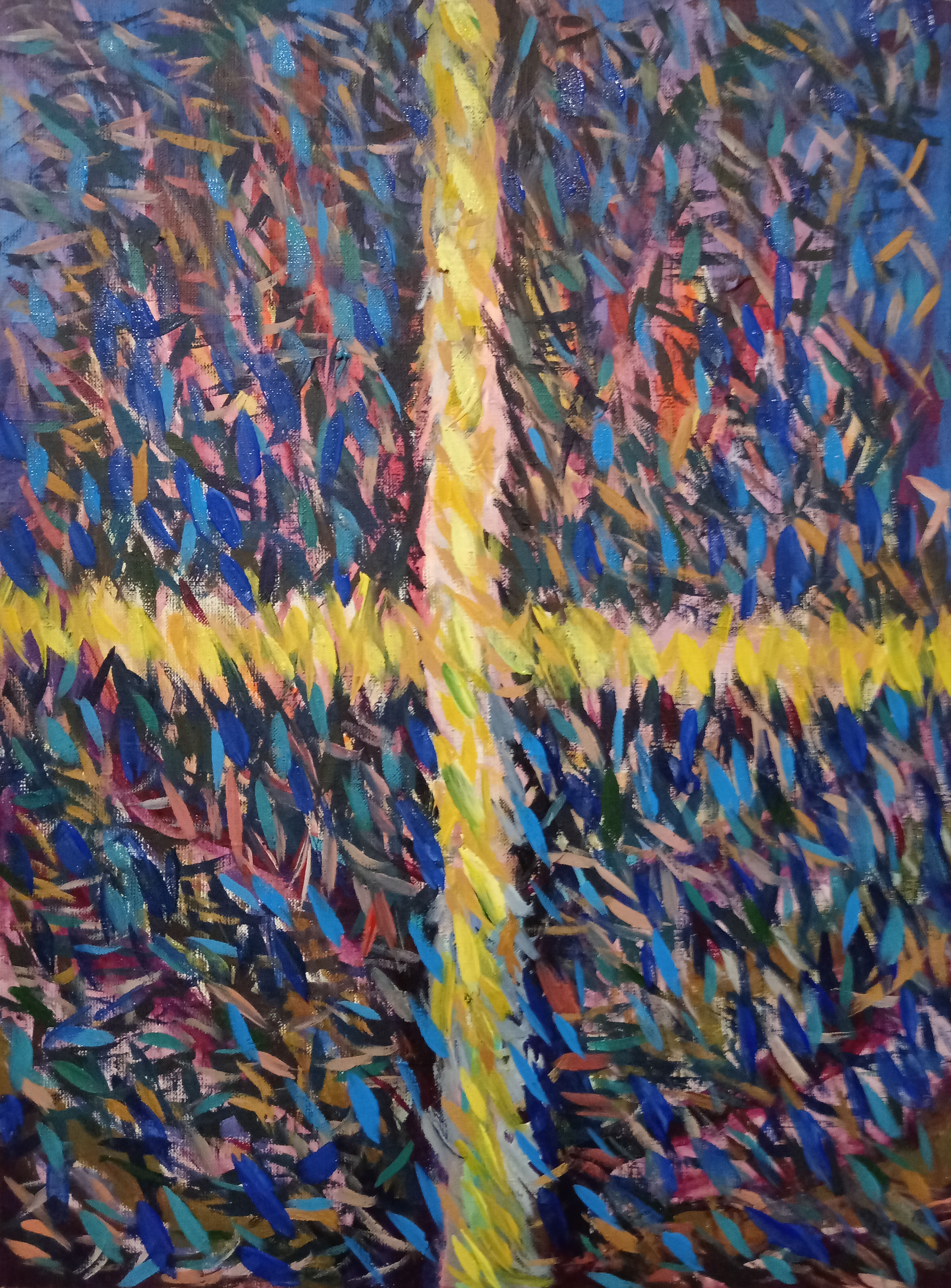 The background of the painting, executed in dark, saturated shades of blue and black, creates a feeling of nocturnal darkness and mystery. It seems to symbolize the difficulties and trials that are encountered on our life’s journey.