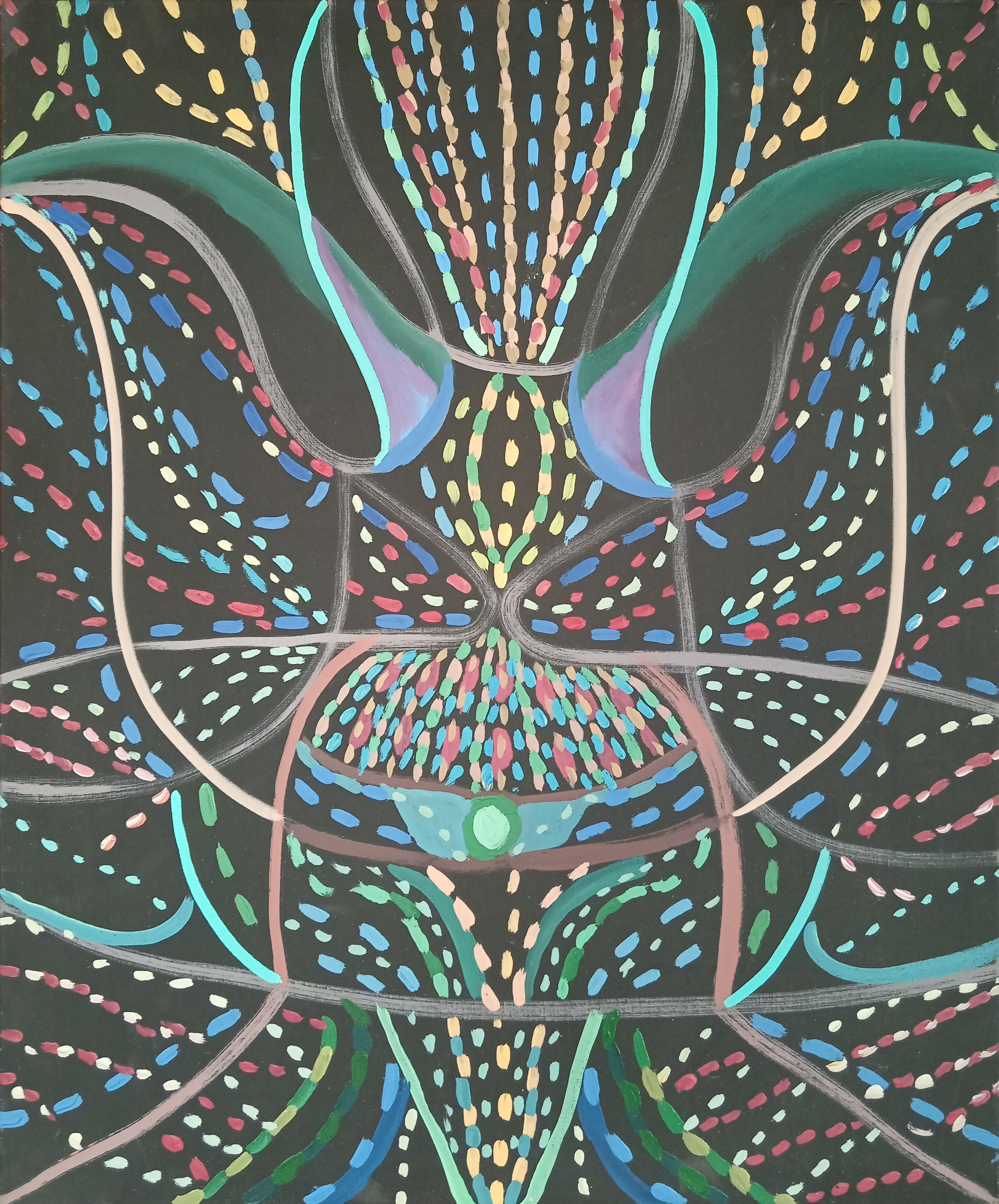 Sharipov Solomon’s painting “Night Flower” is not just an abstract image, but a deep immersion into a world of mystery, intuition, and hidden beauty that is revealed only under the cloak of night. The artist creates a symmetrical and mesmerizing composition, inviting the viewer to reflect on the power of darkness, on its ability to conceal and simultaneously reveal, on the cyclical nature of nature, and on how important it is to be able to find beauty even in those places where darkness reigns. This canvas is not about botany, but about the inner world of man, about his capacity for self-knowledge, and about how often the most cherished thoughts and feelings come to us precisely in the silence of the night.