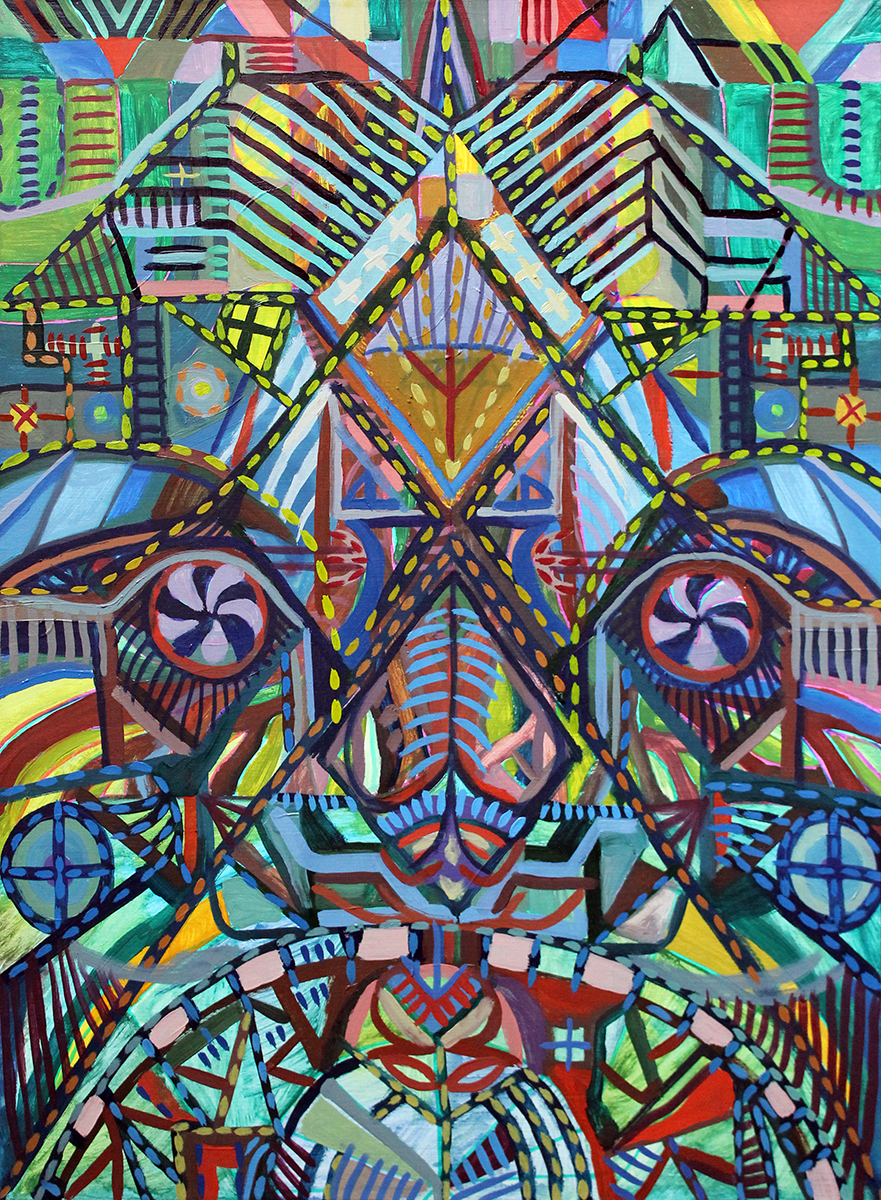 At the center of attention is a complex interweaving of geometric figures and symbols. Their interaction creates a feeling of movement and energy, as if a process of constant change and transformation is captured on the canvas.