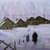 This canvas depicts a Russian village in winter. In the foreground, a country road is noticeable, along which two people are walking - an adult and a child, perhaps a grandmother with a grandson. In the distance, there is a row of slanted wooden houses with chimneys, old fences and blackened power poles run through a snowy field. The forest in the background consists of light, almost transparent trees, as if covered with frost. The color scheme is done in cold violet-blue and white shades, perfectly conveying the fragility and tenderness of a winter morning, the village silence, peace and comfort of small settlements.