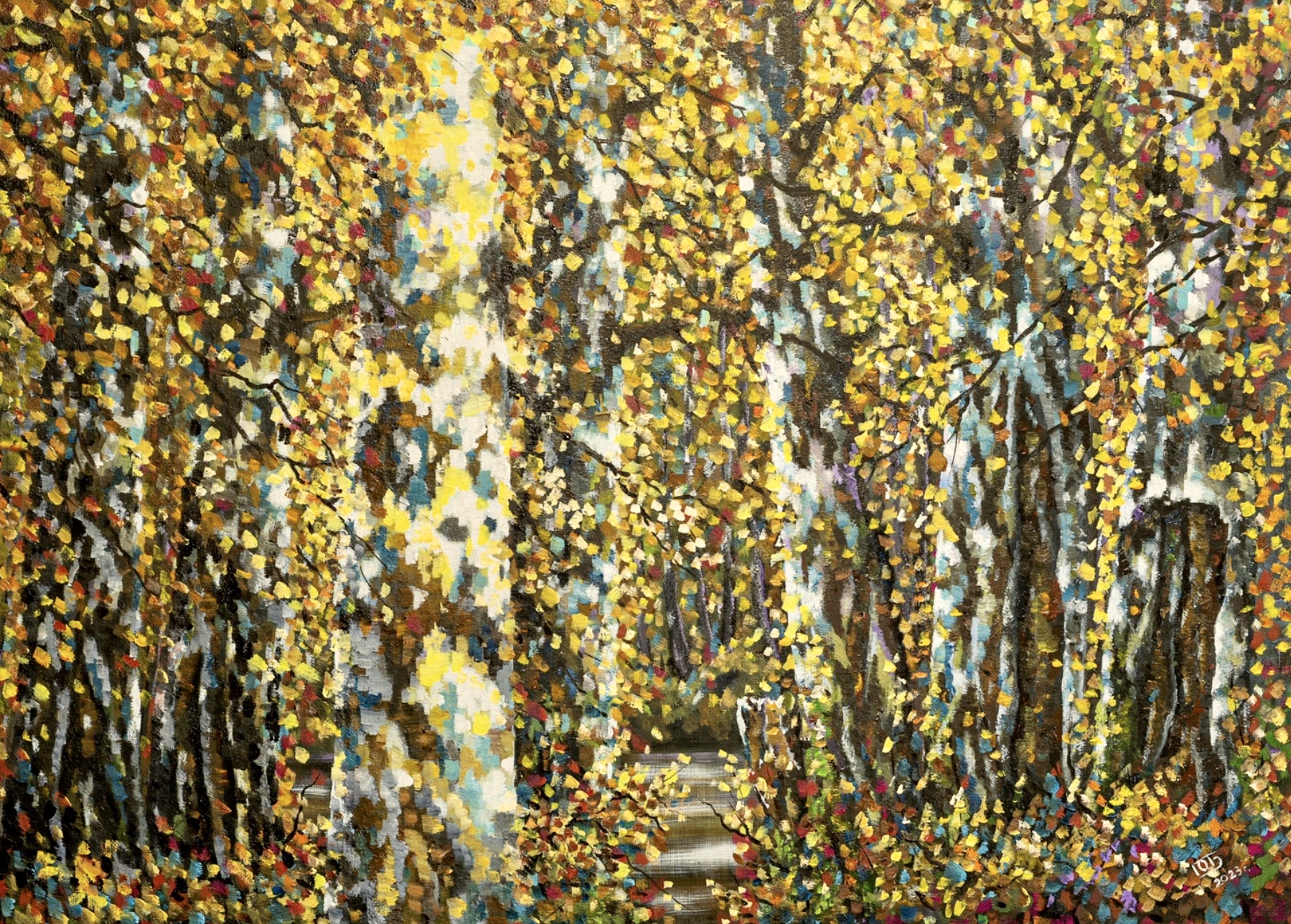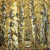 The painting depicts a dense autumn forest, literally drowning in yellow and golden shades of foliage. The sunlight softly disperses between the tall straight tree trunks, strewn with a mosaic of yellow, white and brown leaves. The foreground is decorated with a light wide trunk of a birch. The canvas is painted with brushstrokes and dots, creating a feeling of light swaying of foliage and the breath of autumn. In the center of the painting, a narrow path can be guessed, leading the viewer into the depths, to the dissipating glow of the golden forest. The work is filled with a warm, ringing atmosphere, in which one can feel the transparency of the air and the warmth of an autumn day that has not yet gone away.