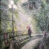 In the foreground is a curved wrought iron bridge with beautiful lanterns, the light of which is reflected in the impenetrable rainy haze. In the center is a lonely figure under a pink umbrella, standing by the fence of the bridge. The entire space of the painting is filled with the smallest chaotic brushstrokes depicting streams of rain and creating an atmosphere of fog, humidity and coolness. In the background, through the curtain of rain, you can see the dome and façade of a majestic architectural structure - perhaps a cathedral or a palace. Despite the rain, the painting is filled with soft light, solitude and the special charm of a rainy evening in a big city.