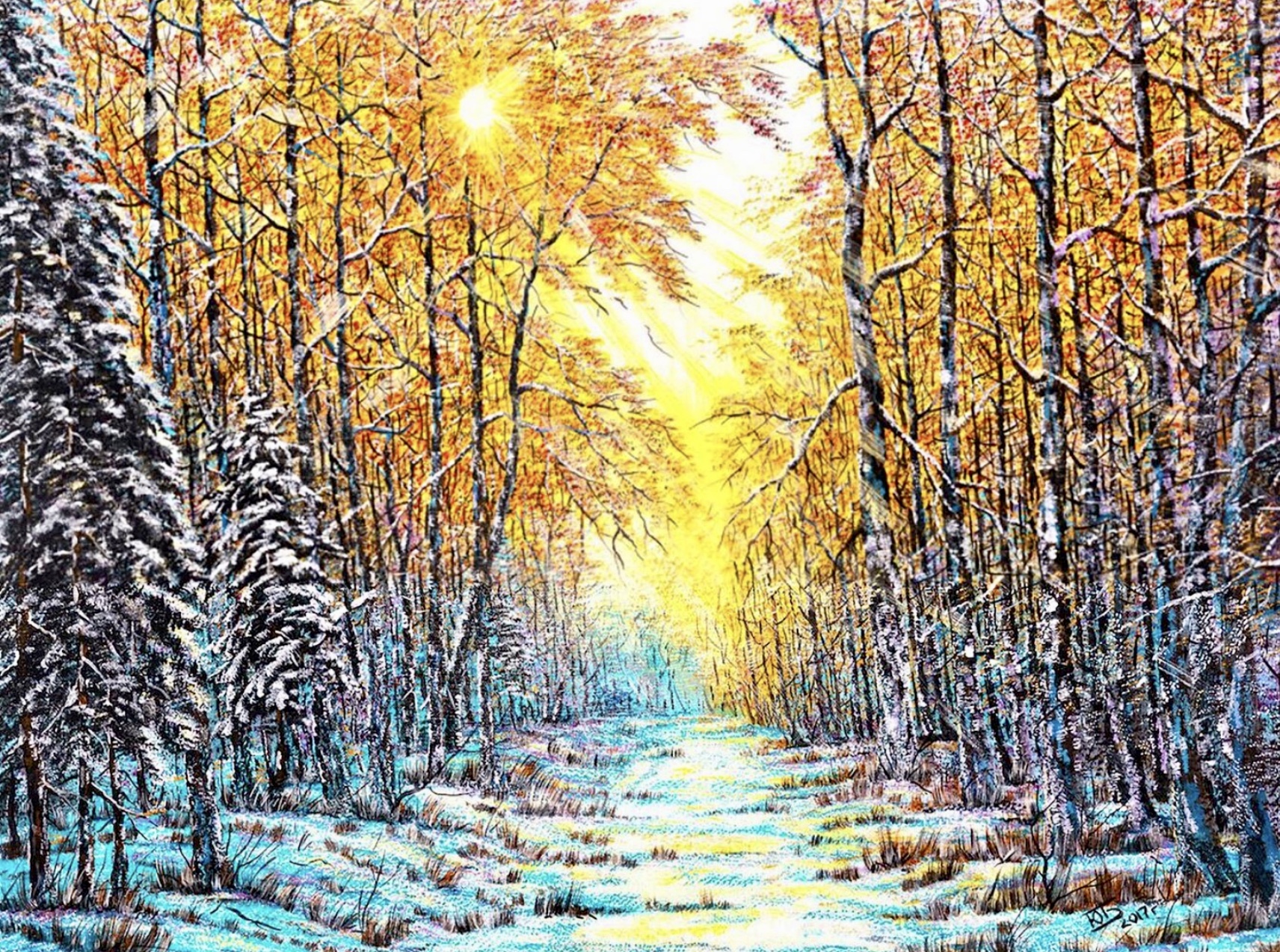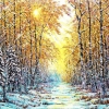 This painting fills the viewer with a feeling of fresh frosty air and the brightness of the winter sun. Along the clearing, stretching into the distance between tall trees, blinding golden rays of the low sun break through. The crowns on the left are covered with frost and snow, and on the right they are already touched by the bright orange and yellow colors of the setting light. Intertwining with each other, blue and orange, cold and warm tones, create an atmosphere of a changing state - as if this is the junction of two seasons: autumn and winter. The composition lives with dynamics - from the cold foreground to the horizon warmed by light.