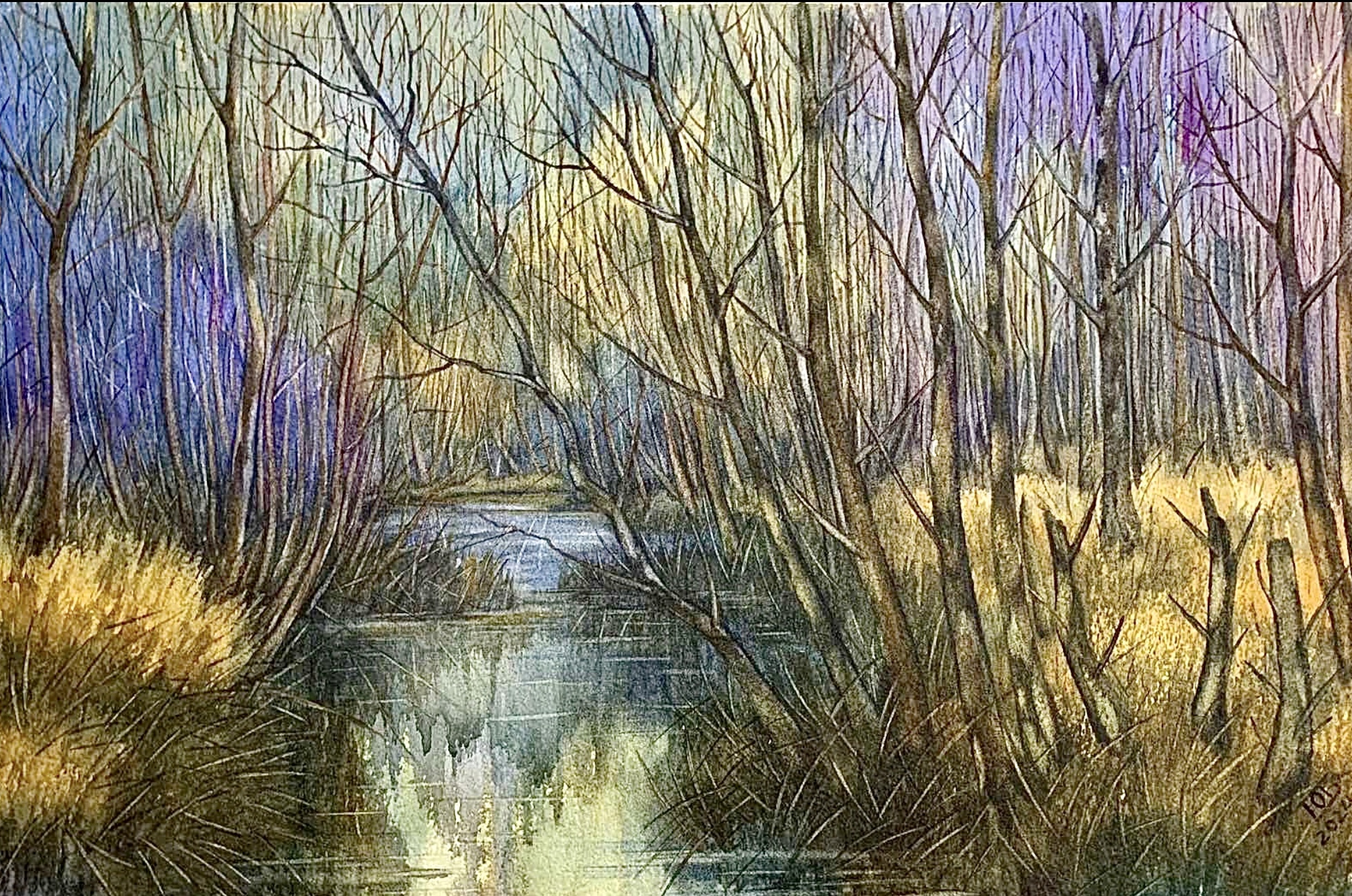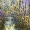 This horizontal canvas depicts a forest stream or a small river, spilling out among dense bushes and young trees. The branches hang over the water, creating a shaded arch, and the light water reflects the muted range of the surrounding tree trunks. The colors are calm: golden, pearl gray and soft turquoise shades evoke a feeling of awakening nature, light dampness and the solemn silence of early spring.