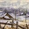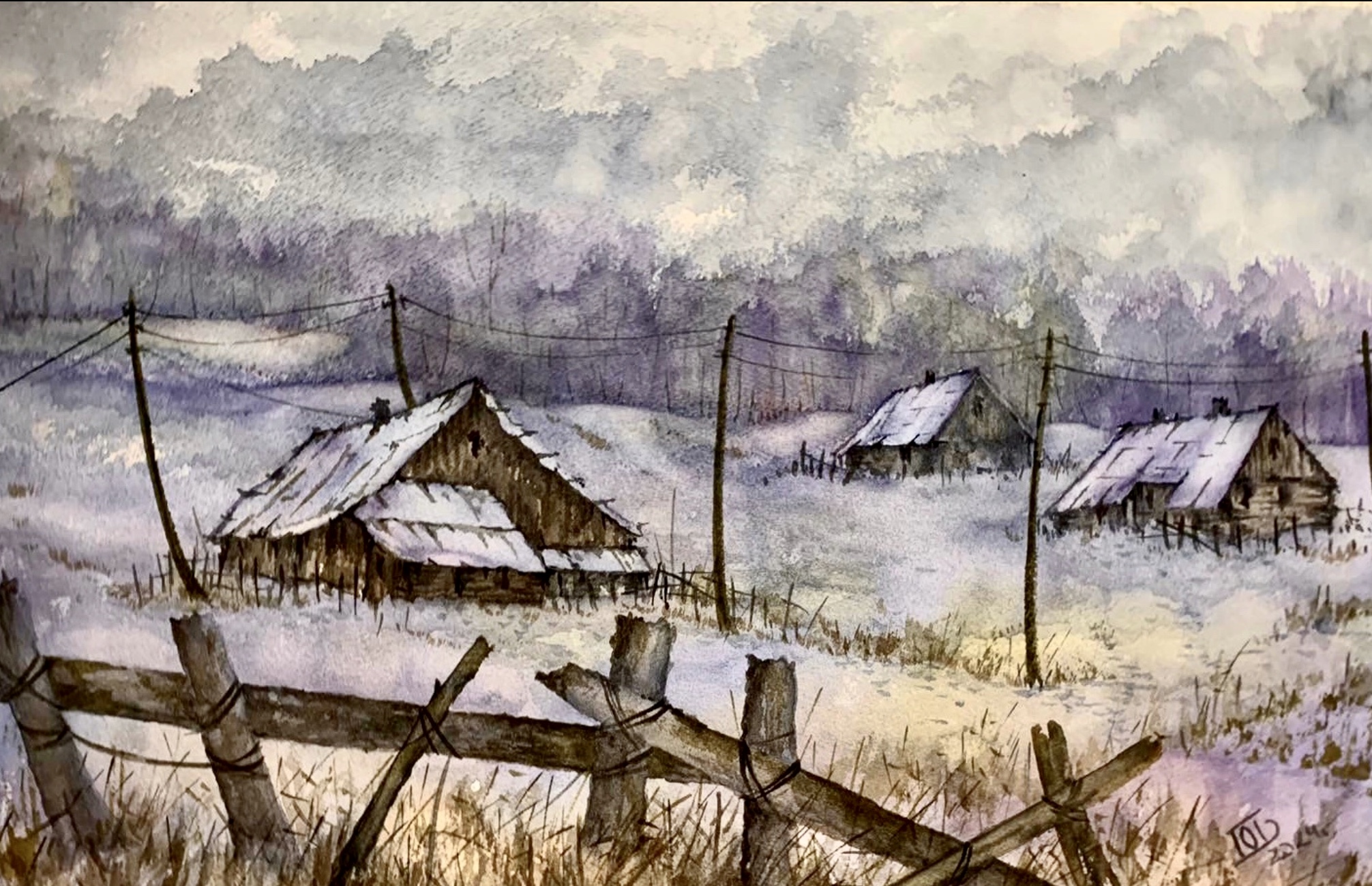 This watercolor painting conveys the atmosphere of a quiet winter rural outback. In the foreground is a slanted wooden fence, behind which snow-white fields stretch upward to the horizon. Old wooden huts with snow-covered roofs are sinking with visible difficulty between the snowdrifts. In the distance are several more houses and a forest strip, which the artist conveys with subtle accents of violet and gray shades. Above all this hang clouds, low-hanging winter skies, and lonely poles and wires add notes of a modern domestic village to the scene. The painting feels both a slight cold and the comfort of home warmth.