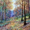 The canvas shows an autumn forest, flooded with bright sunlight that breaks through the trees. Soft light illuminates the clearing covered with a layer of fallen multi-colored leaves. The forest looks transparent, with thin, tall trunks turning into a natural portal into the depths of the forest. The change in shades from yellow-orange in the foreground to blue-violet on the horizon creates dynamics and depth. The picture conveys the lightness and beauty of golden autumn.