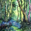 A bright watercolor, saturated with green and turquoise shades, depicts a deep forest thicket. Among the tall slender birches and other trees, light stripes of sunlight stand out, penetrating through the dense foliage. Blue and purple highlights can be guessed in the shadows of bushes and grasses. The grass in the foreground is thickly drawn, with clear, tousled brushstrokes. At the very heart of the painting is a path that goes into the transparent green depths, as if inviting the viewer to go inside and dissolve in the tranquility of nature. The painting is filled with a sense of life, freshness and summer energy.