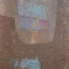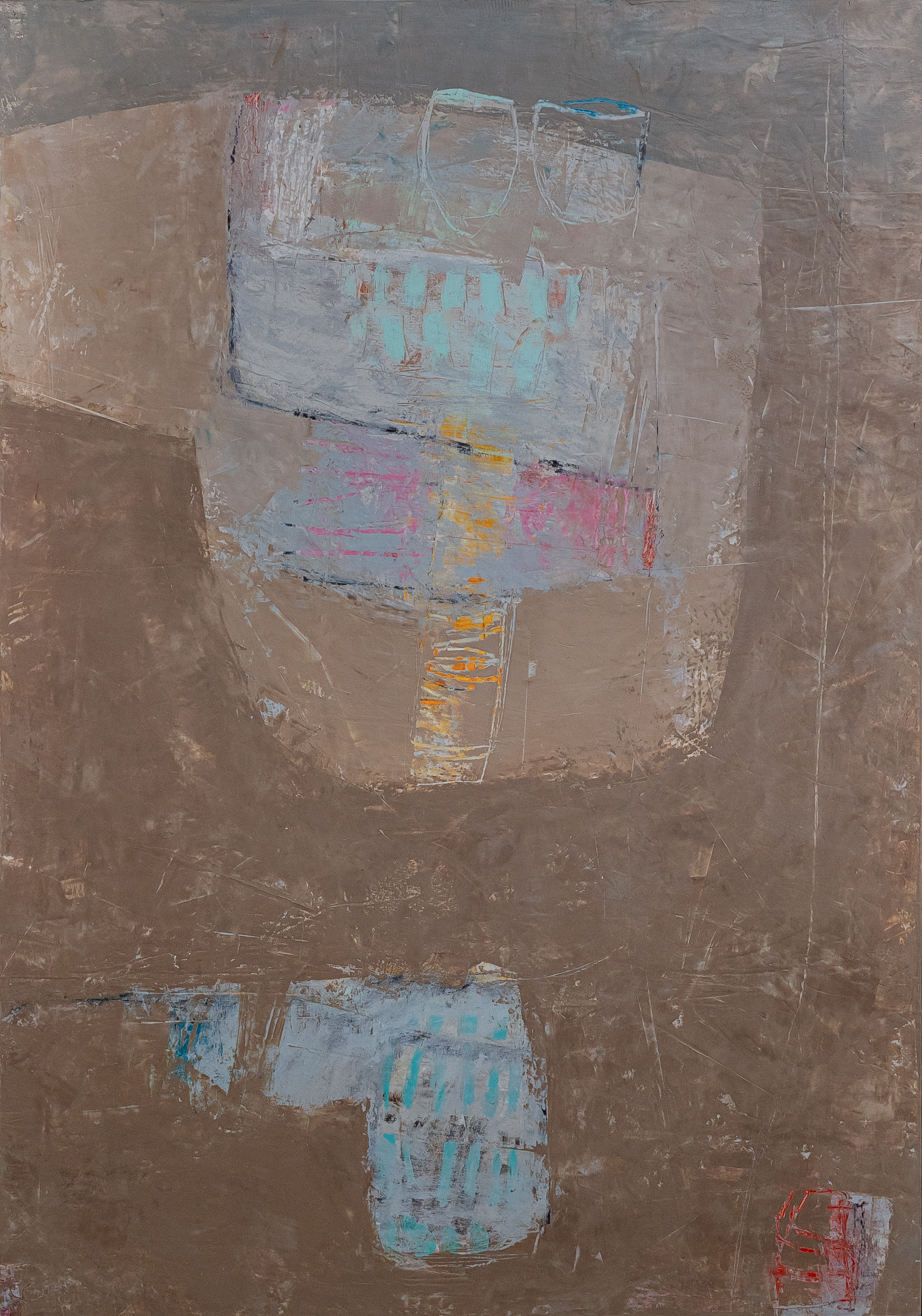 The work is built on a complex warm brown-beige palette with splashes of blue, pink, yellow and orange. In the center are two large abstract forms, as if nested inside each other or in a dialogue. The inner texture of the canvas resembles clay or sand - multiple brush marks and scratches are visible here. Accent spots of pink and blue add a sense of inner life to the monolithic forms, and a small bright red element in the corner attracts the eye, balancing the composition. The painting seems to be a search for balance between stability and fragility, peace and movement.