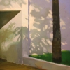 The painting depicts the corner of a modern building, illuminated by soft sunlight. In the center of the composition is a thin palm tree trunk, casting a light shadow on a light wall. The foliage of the trees and bushes creates an elegant play of light and shadow, and the green grass and neatly trimmed bush emphasize the atmosphere of calm and comfort of a sunny day. The artist conveys light spots with special attention, emphasizing the combination of architecture and nature.