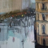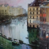 An urban landscape after the rain, painted from a high vantage point. The viewer sees a block of historic houses connected by streets and a canal. A large building in the foreground, with its characteristic dark roof and yellow walls, sets the architectural rhythm of the composition. The canal reflects the sky and city lights, dissolving the outlines of buildings and passers-by. Individual cars move along the embankment and the road, their tracks reflecting the blue and purple of the sky, slightly cloudy, with purple clouds. The painting is filled with the vital dynamics of the city and a slight melancholy typical of a cloudy or rainy day.