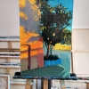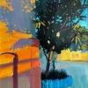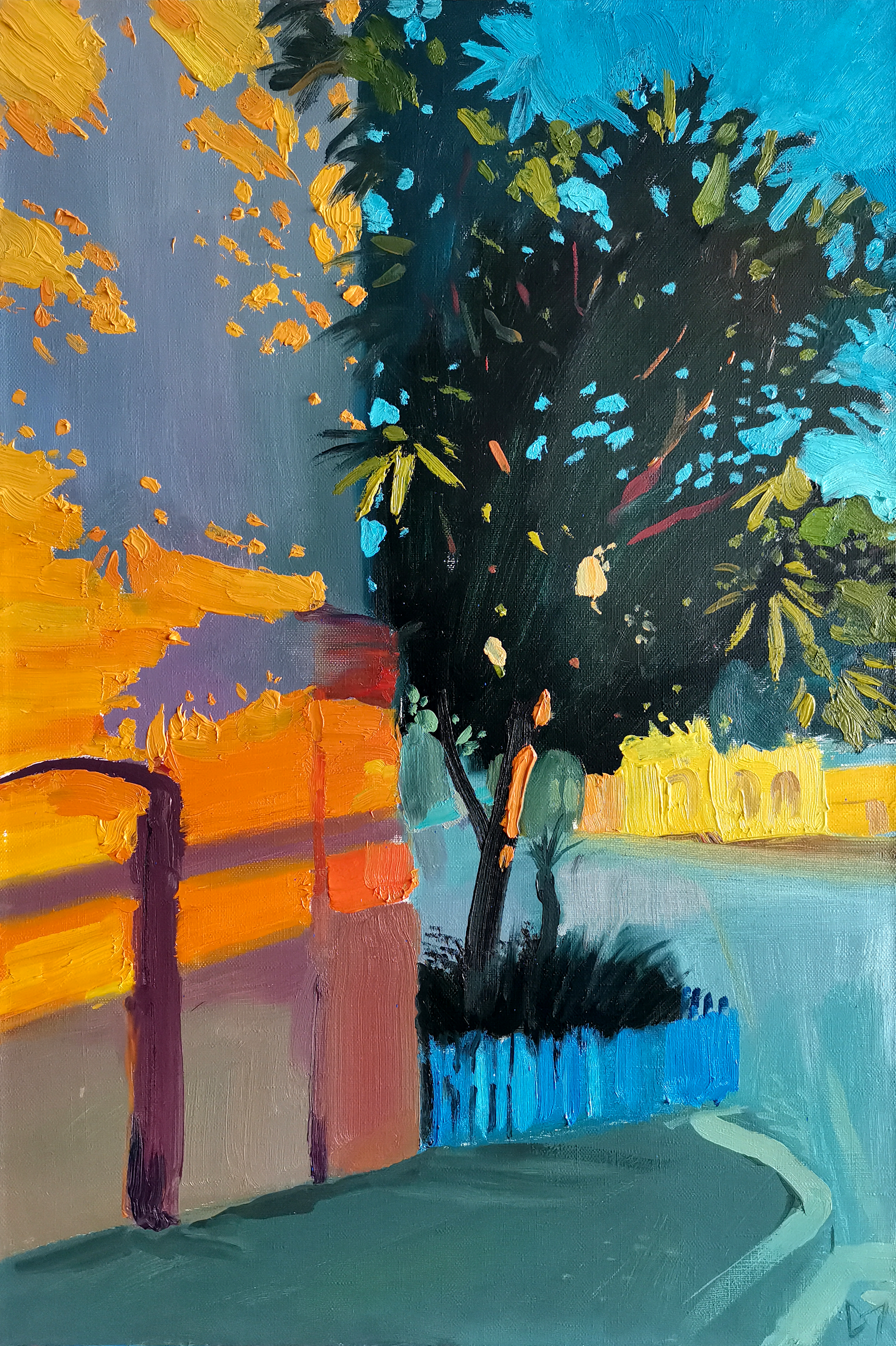 The painting is made with bright brushstrokes and rich colors. The street is bathed in evening or morning light, filling the wall of the building with warm orange and yellow. The dark deciduous tree with blue, green and yellow splashes contrasts with the rich blue sky. The blue picket fence emphasizes the homely atmosphere of a quiet city corner, and the bright lighting and expressive brushstrokes create a sense of the fleetingness and liveliness of the moment.