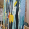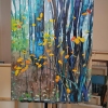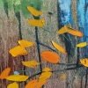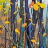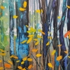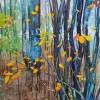 A painting that conveys the mood of an autumn forest in rich decorative colors. In the foreground are bright yellow, green and rare orange leaves, painted in relief, thick paint. They seem to be swirling in the air or have just fallen from the branches. Slender tree trunks line up in the background - a range of turquoise, blue, purple and gray shades creates the illusion of a foggy forest in deep perspective. This composition evokes joy, a feeling of freshness and celebration of nature, drawing attention to the smallest details and color transitions.