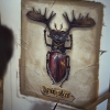 Atlas’s textured painting style gives the painting a special depth and expressiveness. It seems that you can feel the roughness of the beetle’s chitinous cover and the softness of the velvet antlers of the moose.