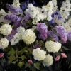Среди сирени видны более мелкие голубые цветы, похожие на колокольчики, которые придают композиции еще один цветовой акцент и разнообразие форм. В левом нижнем углу, ближе к зрителю, пробиваются нежные розовые цветы, возможно, анемоны или маки, что создает эффект многоуровневого цветения.