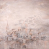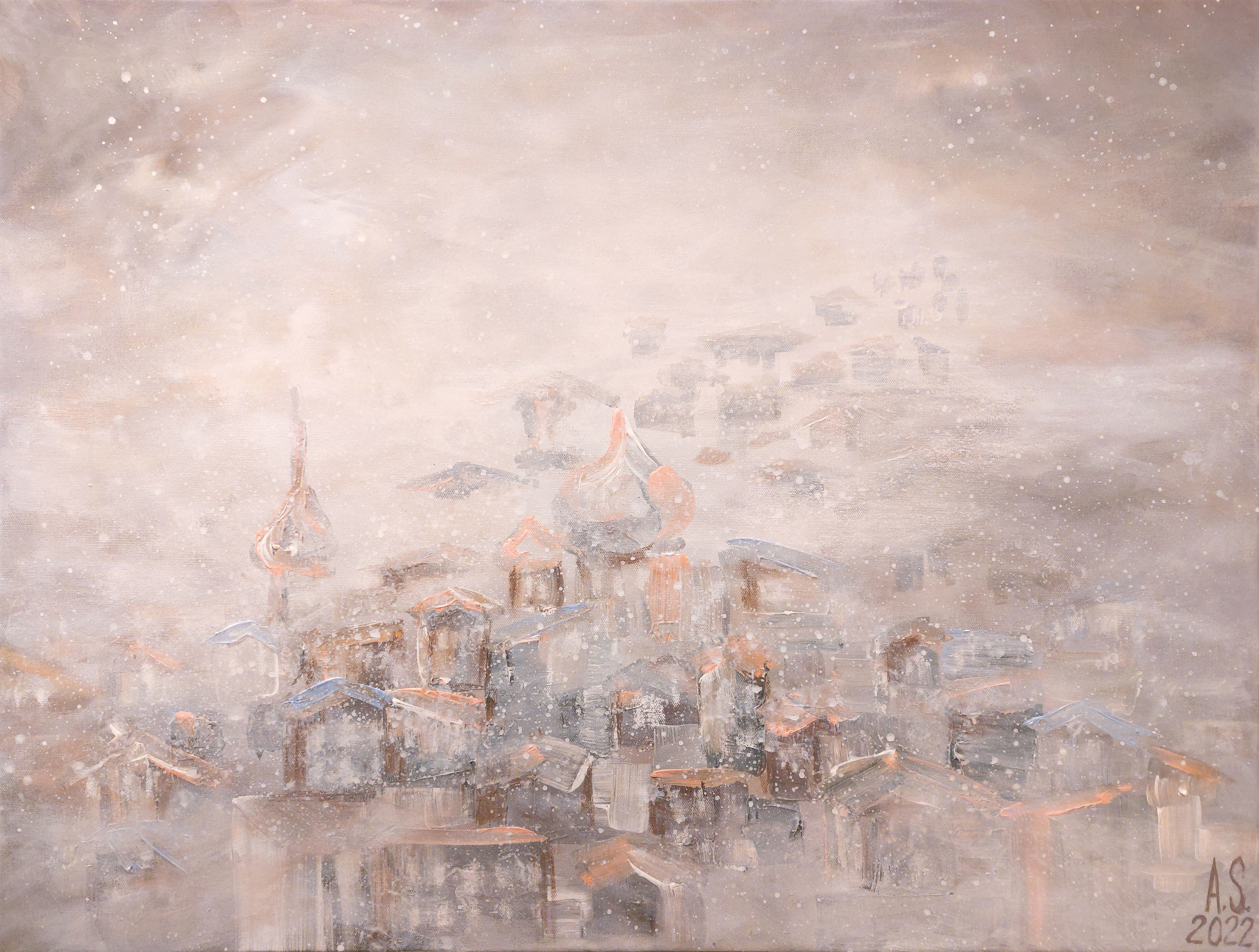 This painting depicts a city barely visible in a dense snow haze. The color scheme is typical for a winter morning - cold shades of gray, white and subtle brick-brown accents. The silhouettes of domes, roofs and houses gradually dissolve into space, receding into the distance. Glowing snowflakes float in the air. The subtle elaboration of details creates a feeling of silence, the fragility of the world, fenced off from the noise of winter weather. The painting evokes thoughts of childhood memories, the warmth of home and a sense of peace.