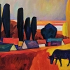 At the center of attention is a cow, peacefully grazing in the meadow, and stylized images of trees and houses located on the horizon. Their combination creates a sense of harmony and tranquility, as if all the elements of the landscape live their own lives, but are inextricably linked to each other.