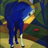 At the center of attention is a blue horse, frozen in a thoughtful pose against a symbolic landscape. Its unusual color, contrasting with the environment, creates a sense of mystery and enigma. It seems that it is part of this world, but at the same time - something else, incomprehensible.