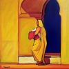 At the center of attention is a female figure, shrouded in yellow attire, standing in a doorway. Her pose, filled with dignity and calmness, radiates wisdom and restrained strength. It seems that she is part of this Eastern world, connected with its traditions and foundations.