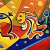At the center of attention is a stylized image of a lion, executed in bright, saturated tones. Its pose, full of dignity and confidence, radiates strength, power, and nobility. It seems that he is the true defender of his home, ready to confront any enemies.