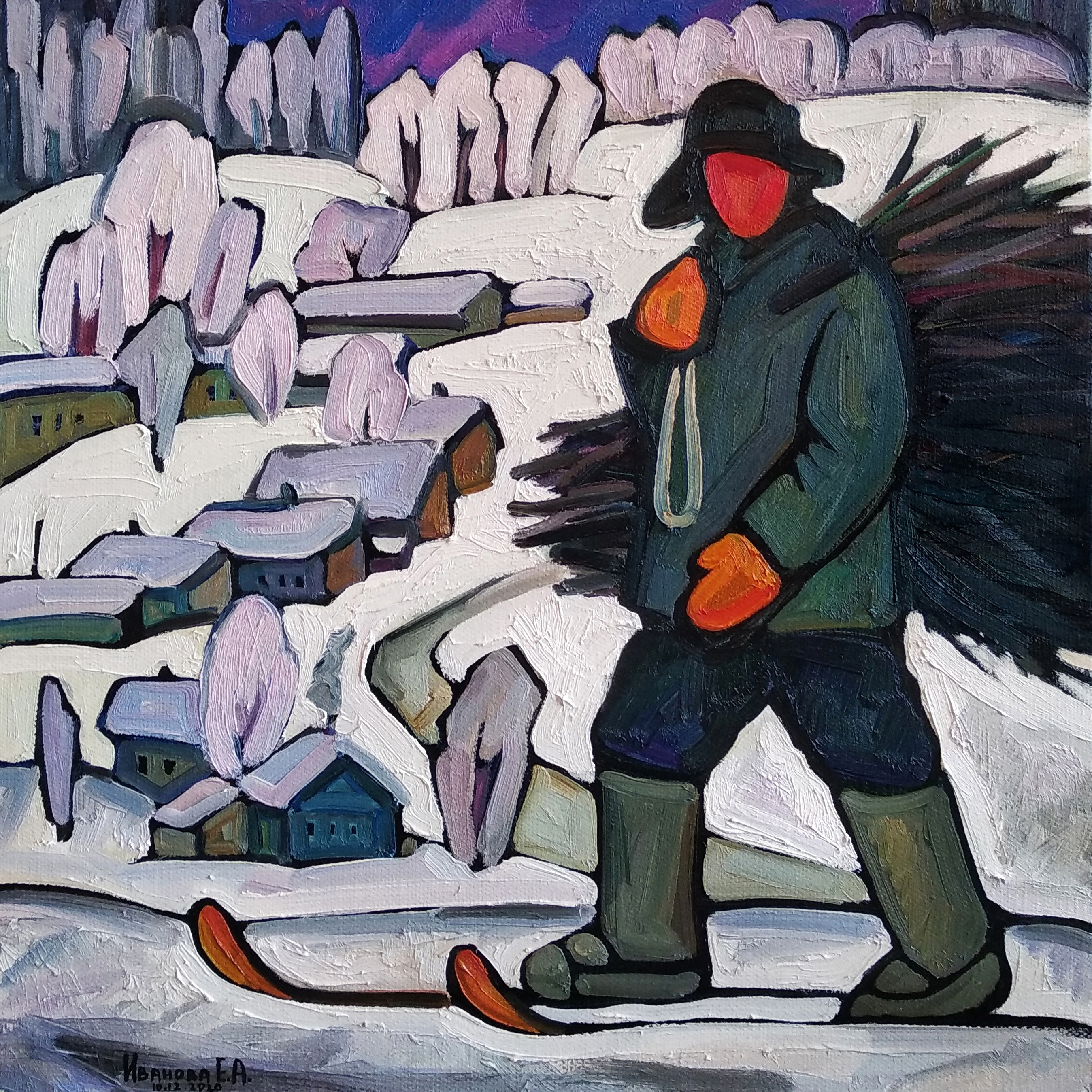 Ivanova’s textured painting style gives the painting a special depth and expressiveness. It seems that you can feel the cold winter air, the roughness of the brushwood, and the weight of his load.