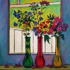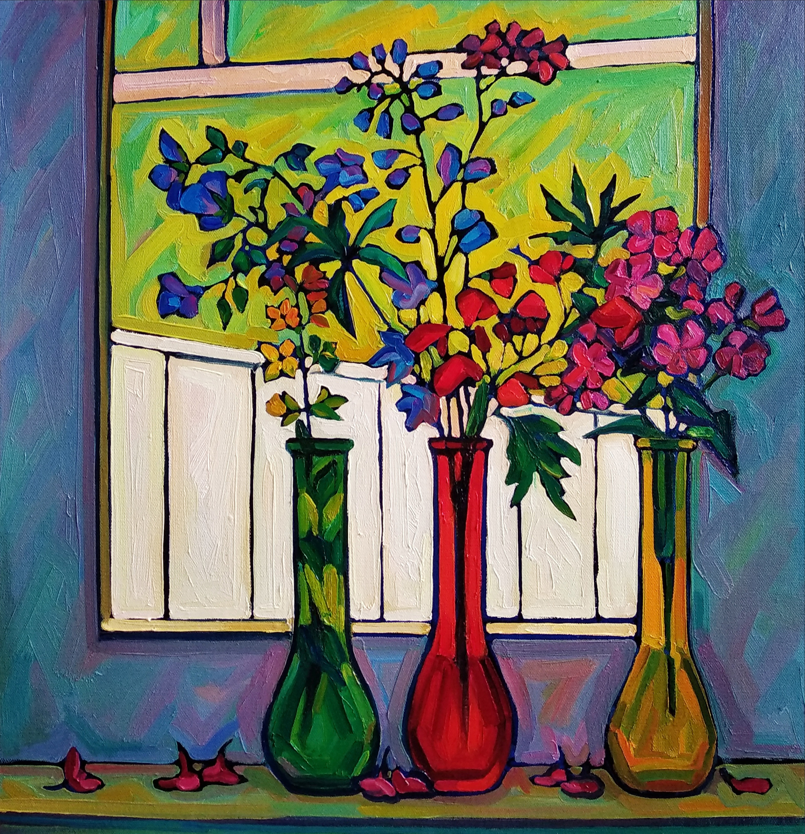 At the center of attention are three vases with different flowers, located on a table in front of a window. Their bright shades of blue, red, and pink create a festive feeling and attract the viewer’s attention. It seems that the flowers have just been cut in the garden, and that they have filled the room with their aroma and beauty.