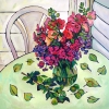 At the center of attention is a bouquet of bright flowers, as if blossoming on the terrace on a warm summer day. Their saturated shades of red, pink, and purple create a feeling of celebration and delight the eye. It seems that they have just been cut in the garden and brought into the house to fill it with aroma and beauty.