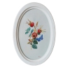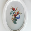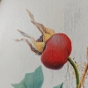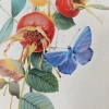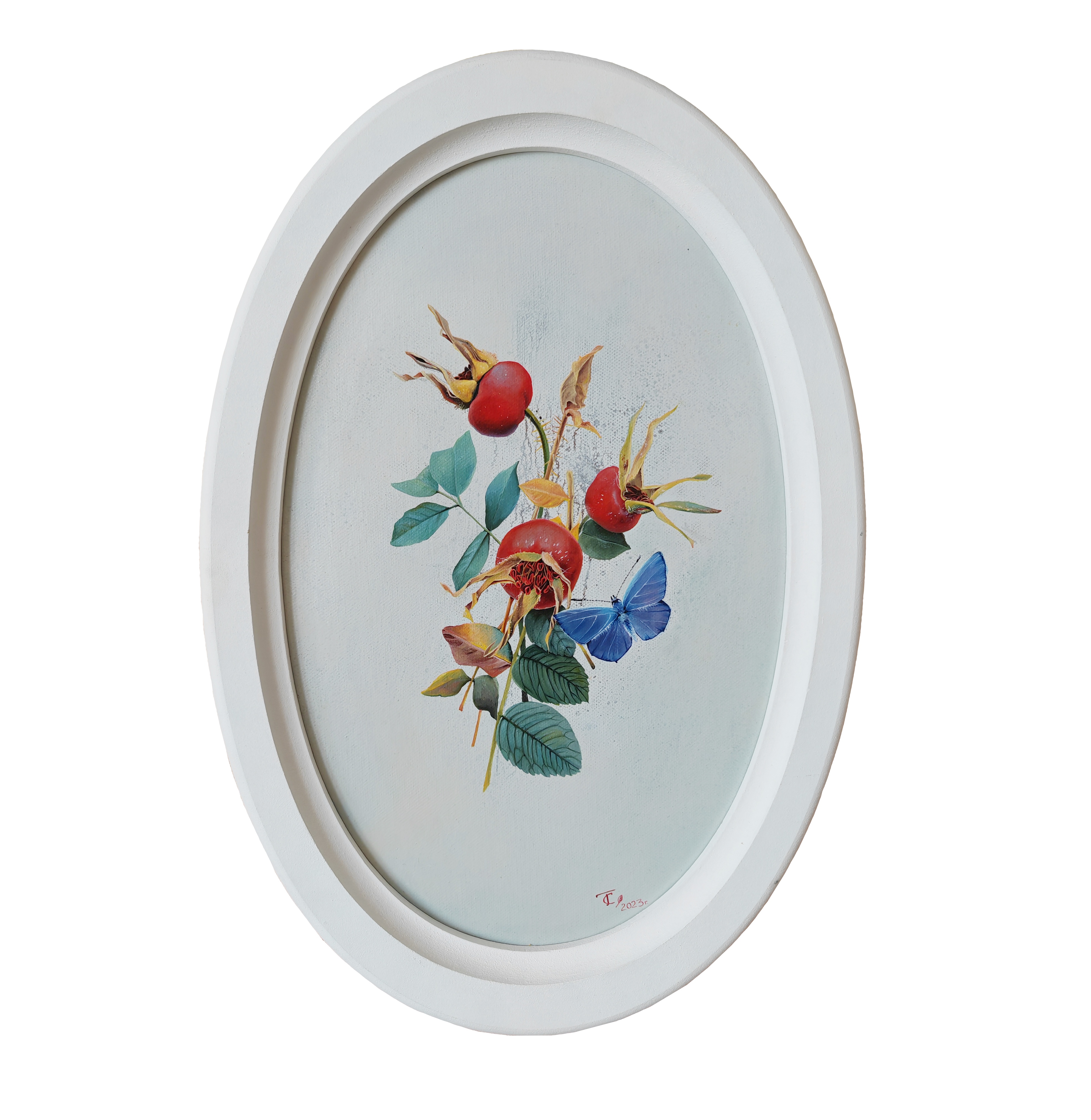 The oval canvas depicts a refined and light still life: three bright red rose hips on thin branches with green and golden-yellow leaves. A blue butterfly is harmoniously integrated into the composition - it gives the work a sense of liveliness, lightness, airiness. The background is done in calm, light tones, which enhances the elegance of the main group. The painting evokes a feeling of tenderness and silence, like a fleeting moment in the garden early in the morning. The oval frame emphasizes the classical elegance of the plot.