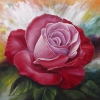 The canvas depicts a close-up of an open rose of a rich red color. The artist conveys the velvety tenderness of the petals, using smooth transitions from a rich dark red to lighter, almost pink shades closer to the center. The background seems to dissolve in a glow of light, enveloping the flower in an aura of lightness and solemnity. The painting is filled with sensuality and warmth, and the detailed elaboration of the texture of the petals seems to muffle time, forcing the viewer to linger on every curve and shadow of the flower.