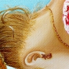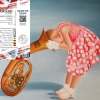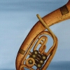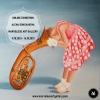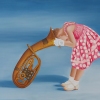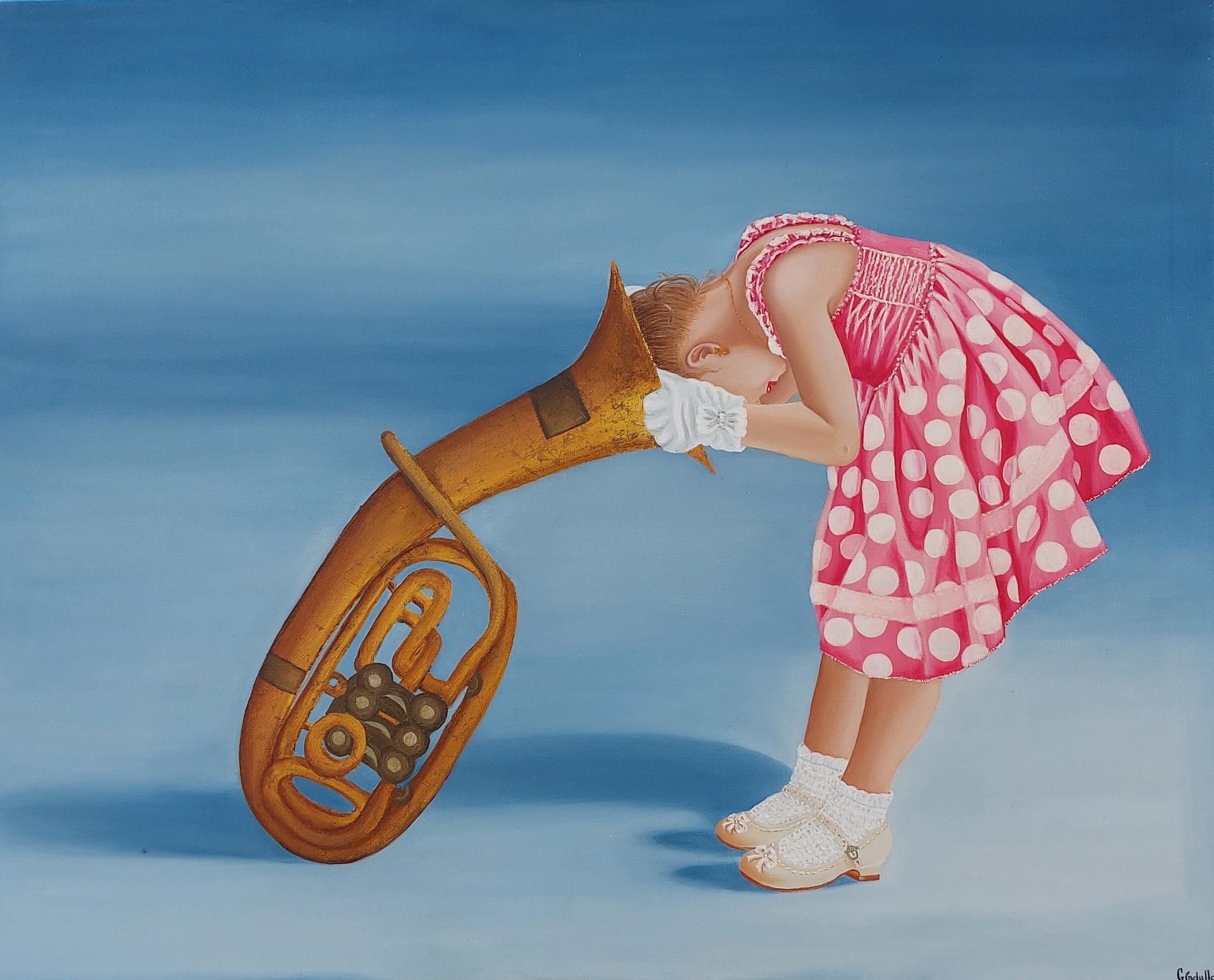 This painting depicts a girl in a bright pink and white polka-dot dress, standing against a flat sky-blue background. The child is leaning with a serious look towards the bell of a large copper tuba, as if looking inside or listening to its inner voice. White gloves, lace socks and shoes emphasize the elegance and slightly theatricality of the image. The painting seems to invite us to think about childhood curiosity, the desire to explore the world in an unusual way and the possibilities of the sound of one's own dream.